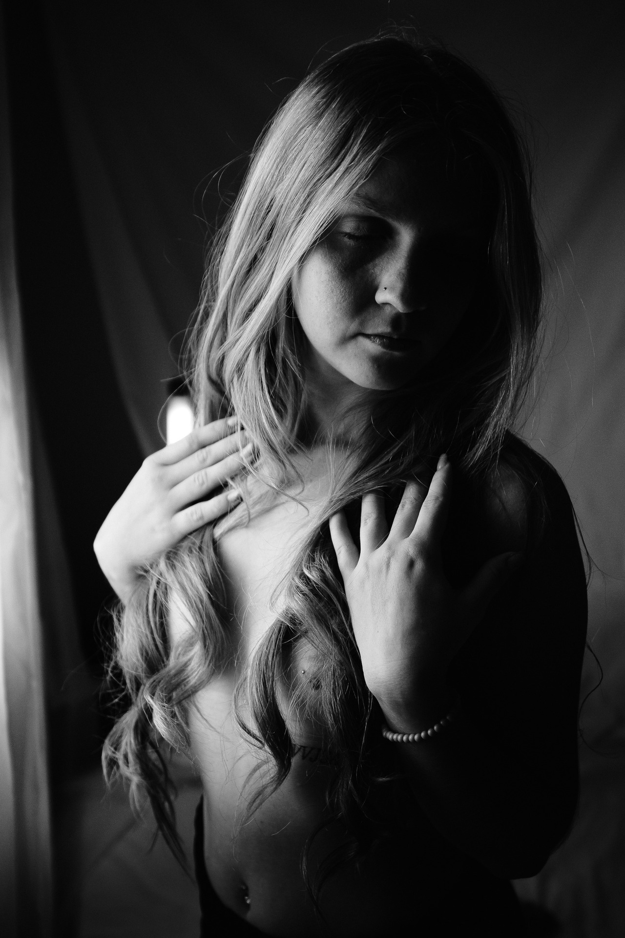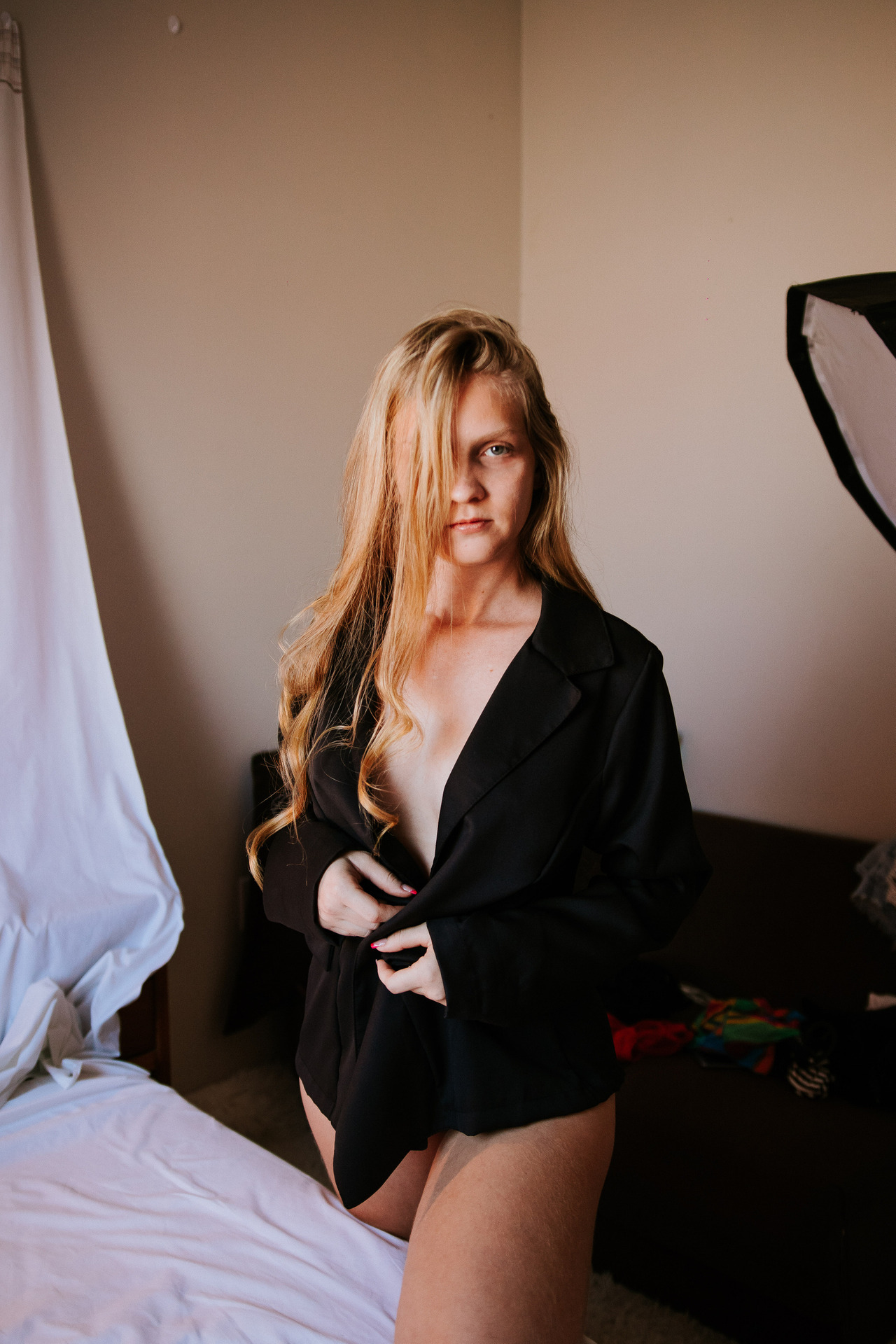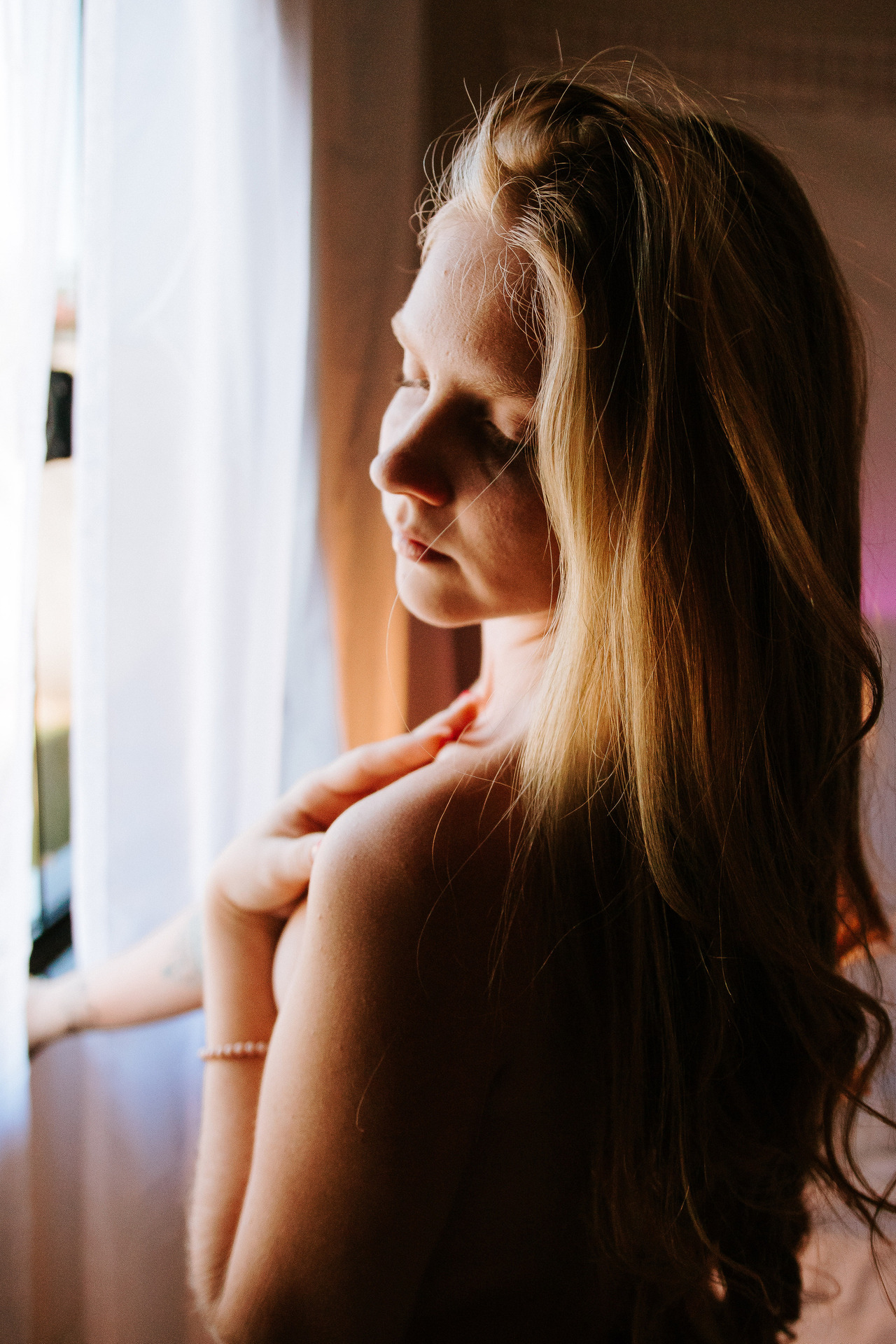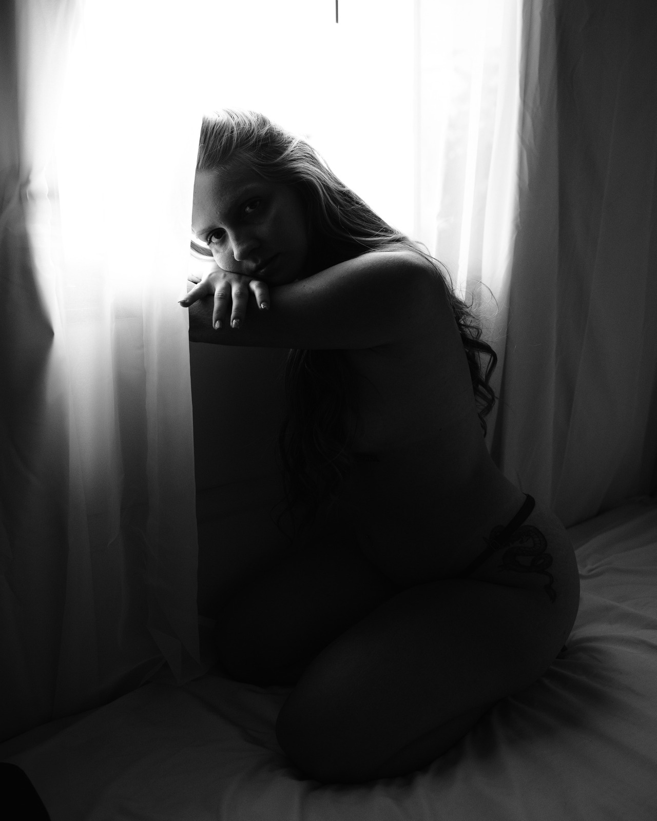 Agora, falando dos detalhes técnicos da foto: posicionei ela de frente pra janela, meio de costas pra mim, com os cabelos cobrindo ao máximo os seios. Queria ir aos poucos, fazendo ela entender o ensaio, entender as poses, perceber que eu não estava ali pra ver como é o corpo dela sem roupa, mas pra quebrar esse dilema sexual que a nossa cultura brasileira coloca em absolutamente tudo.