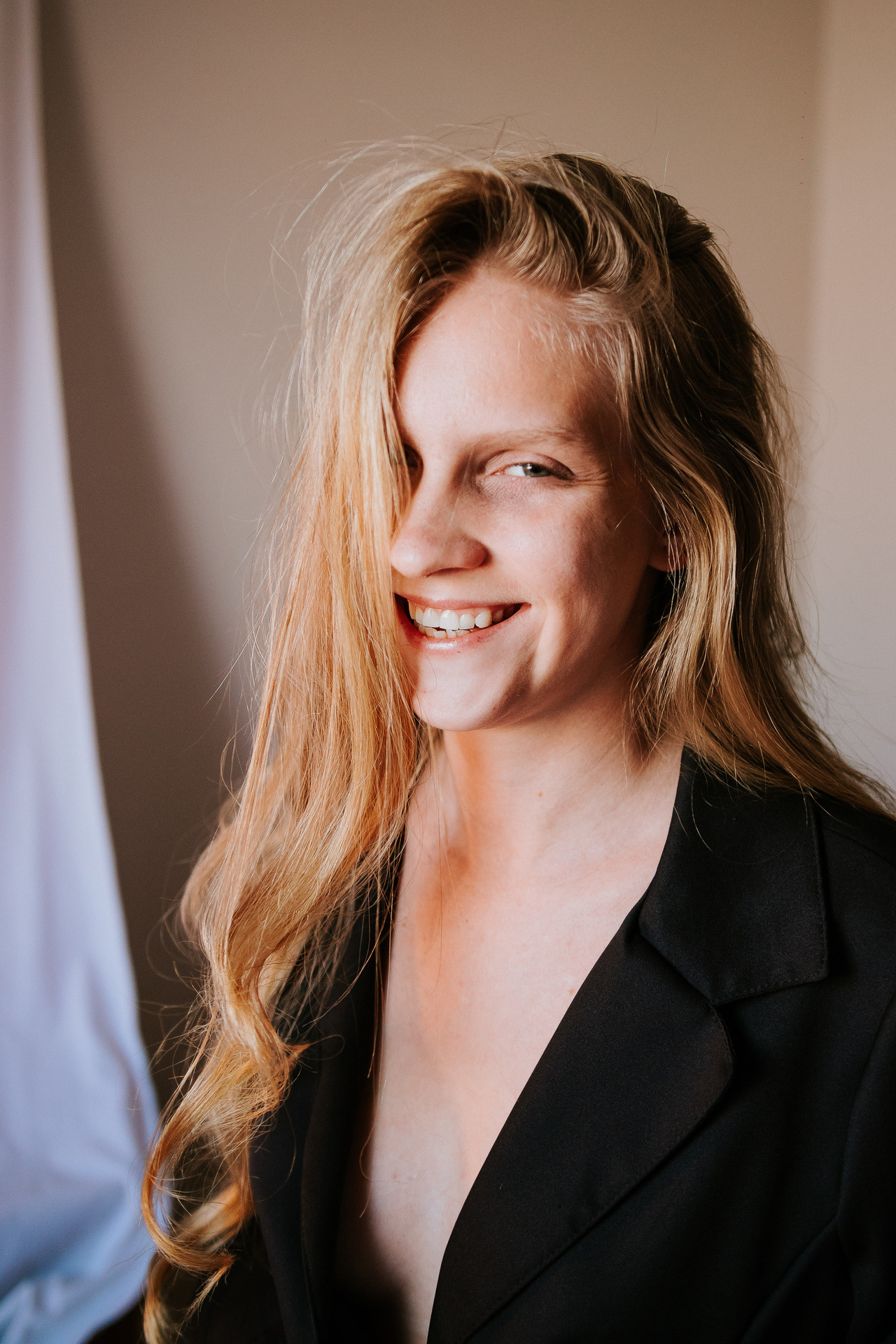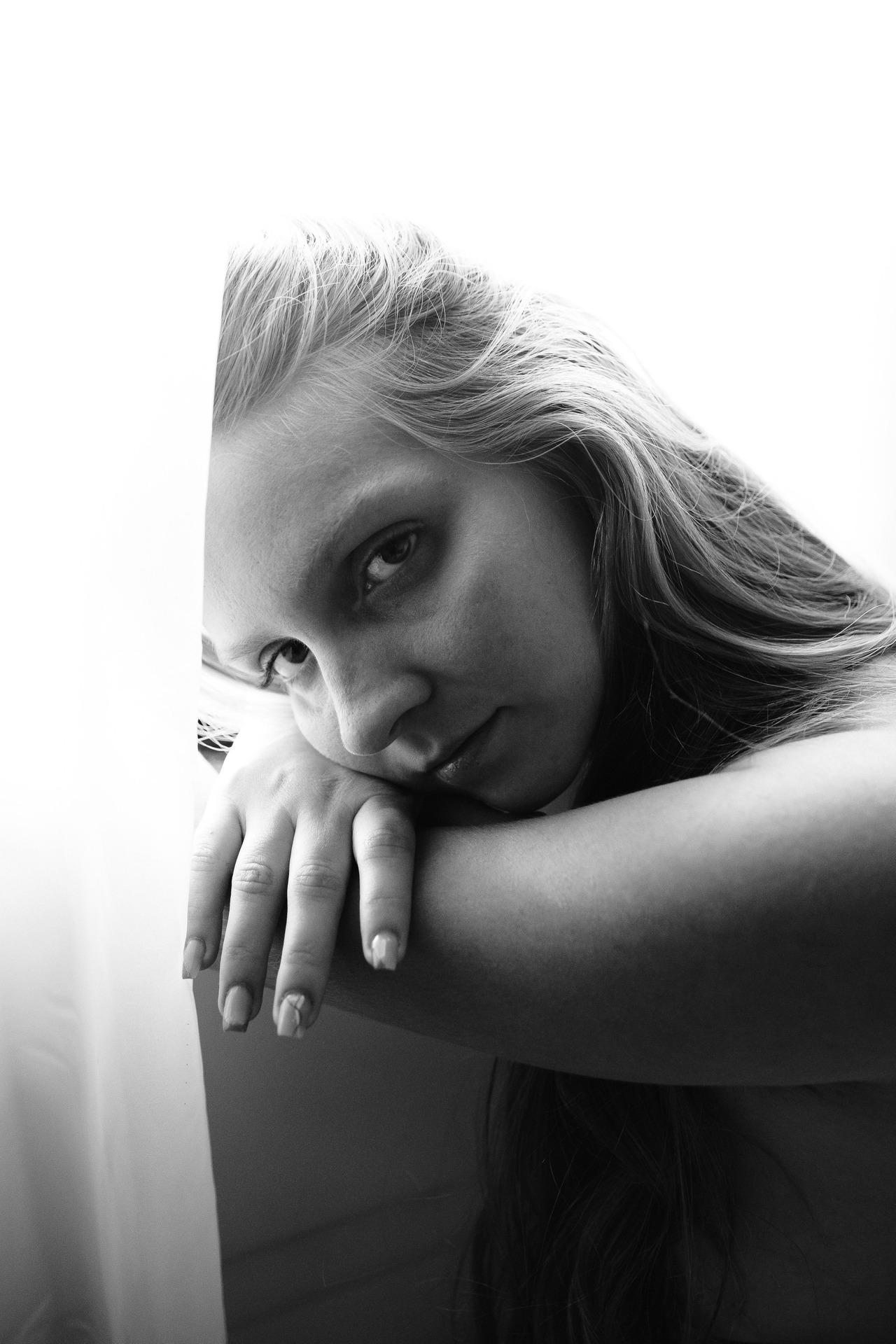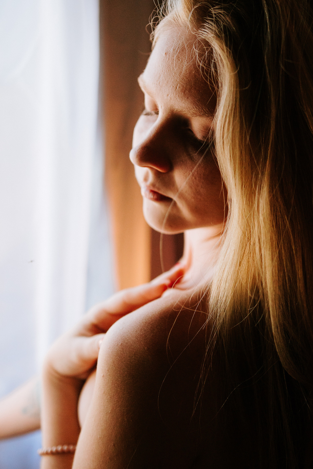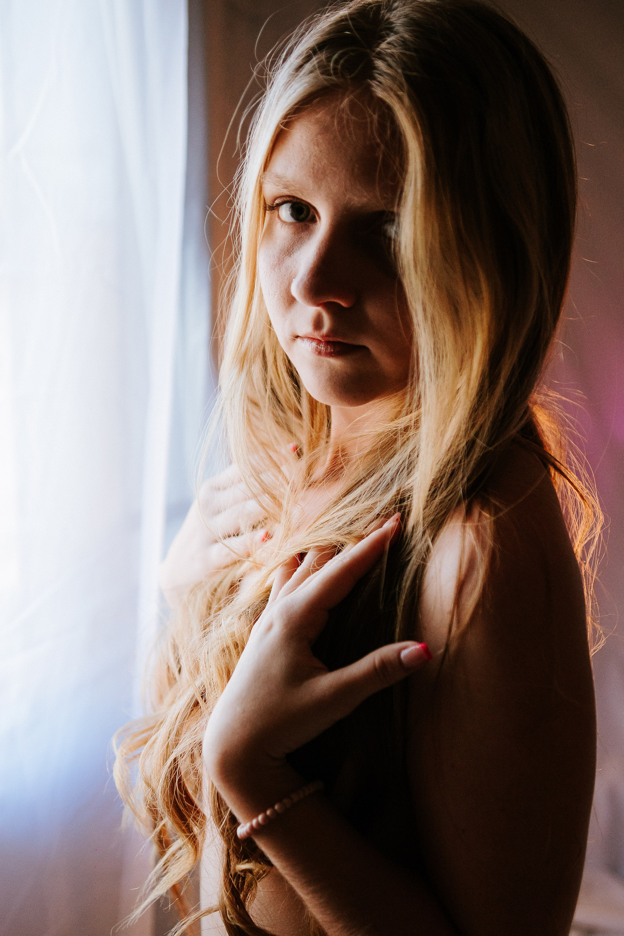 Nessa foto, eu já senti que ela estava mais conectada ao ensaio, então pedi pra que ficasse um pouco mais de frente pra câmera. E, de novo, trouxe o cabelo pra frente, por dois motivos: primeiro, porque a cor dele combinava perfeitamente com a luz da janela e com o tom da pele; e segundo, pra que ela mantivesse esse nível de conforto.