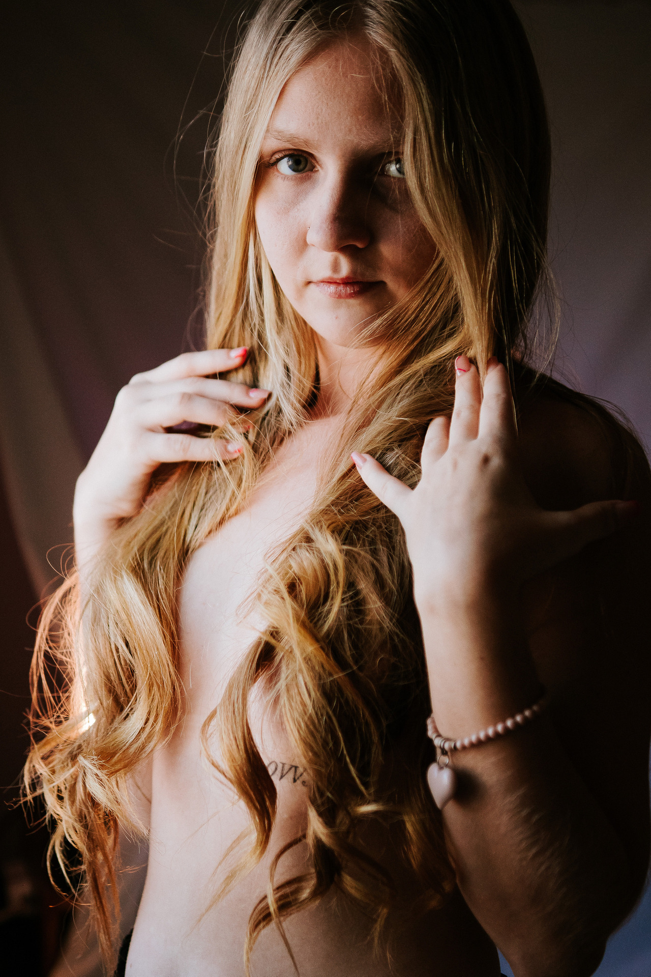 Até esse momento, ela se mantinha no mesmo nível de conforto, porque eu conduzi o ensaio de forma harmoniosa, pra que, dentro dos primeiros cinco cliques, ela já estivesse quase completamente nua — mas, ainda assim, se sentindo segura, confortável e plena.