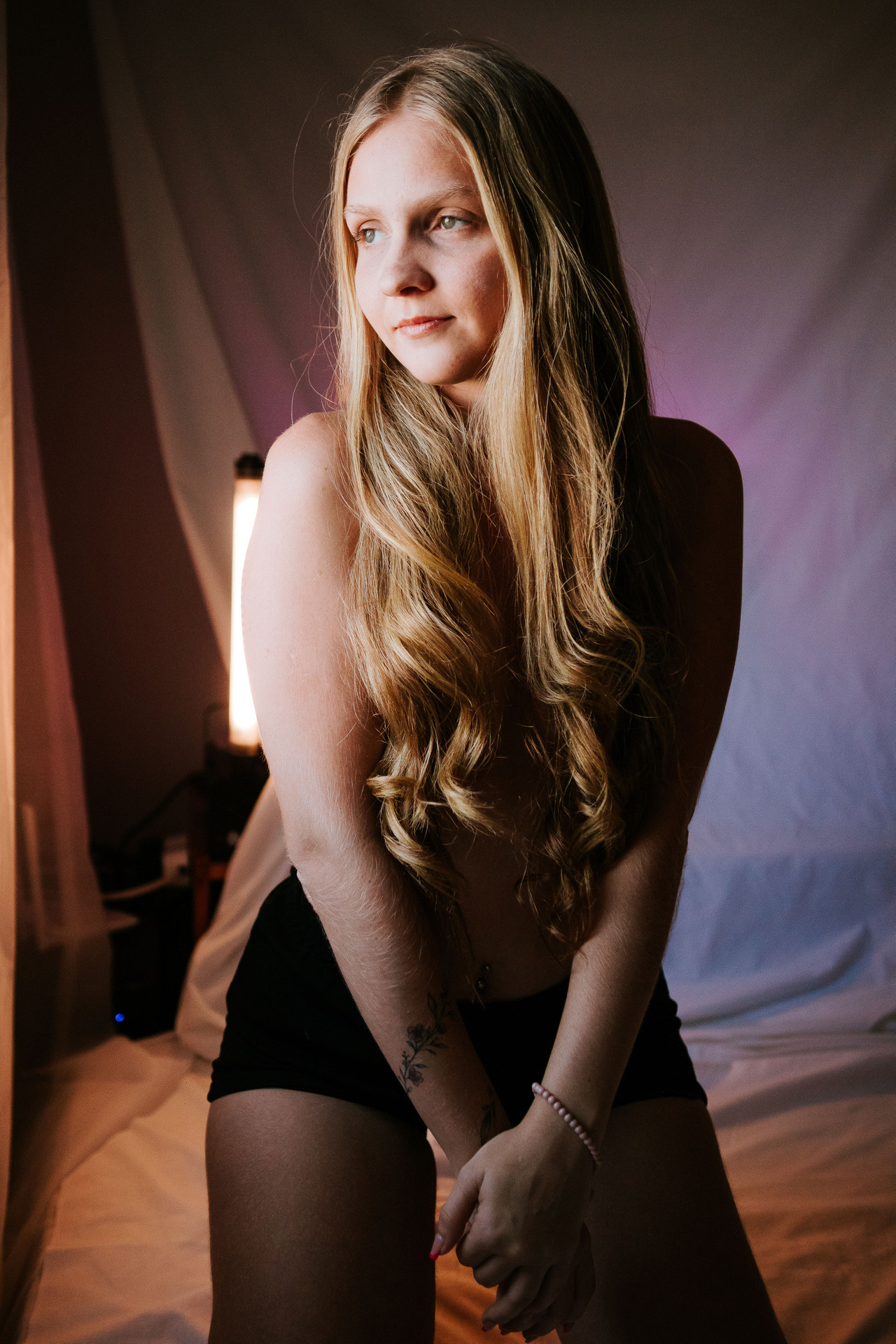A partir daqui, essa pose em específica eu já tinha em mente pra ela fazer, caso chegássemos nesse nível. A ideia dela ficar com as pernas cruzadas na frente do corpo, sentada completamente nua, veio de uma referência de um ensaio russo.
