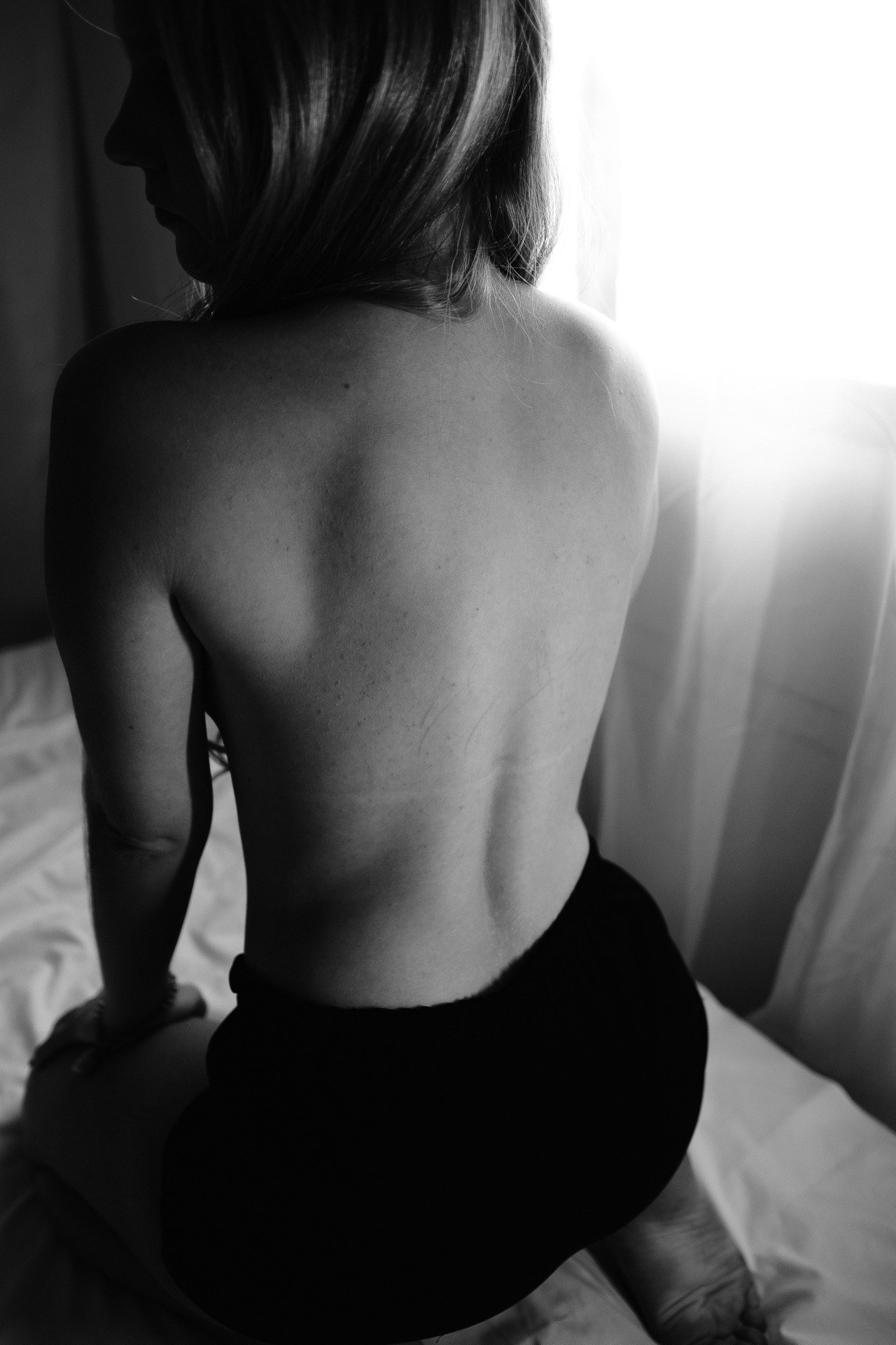 Nessa fase, decidi voltar pras costas dela, porque senti que, mesmo que só um pouquinho, ela ficou tímida ao se revelar totalmente de frente pra câmera. Aqui, busquei uma foto mais sensível, explorando as costas através do jogo de luz e sombra.