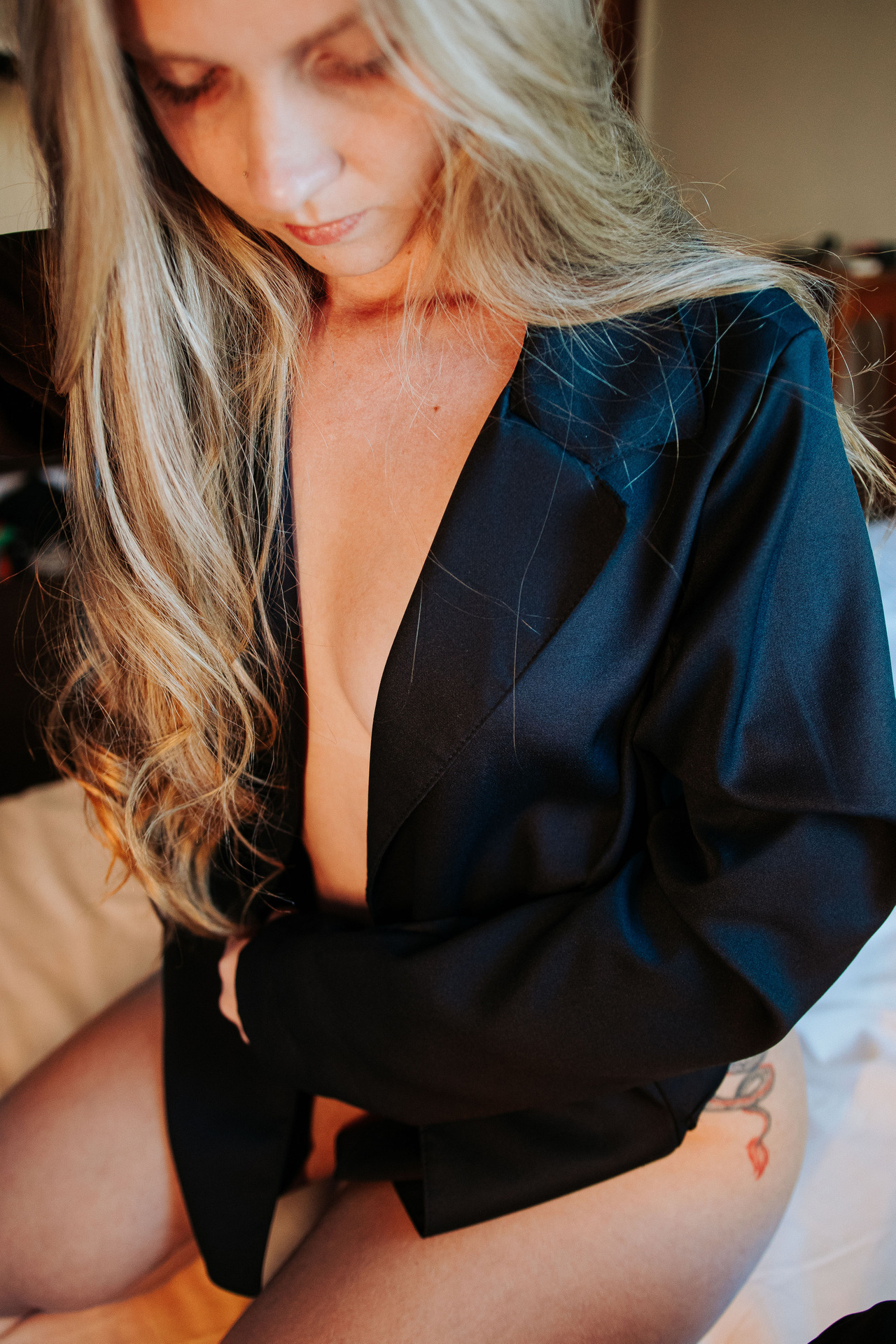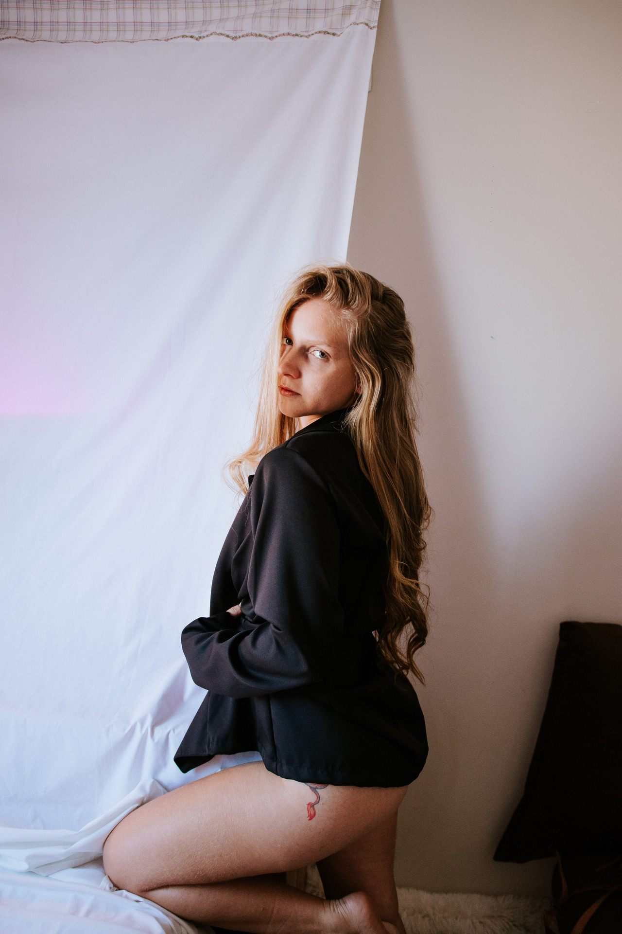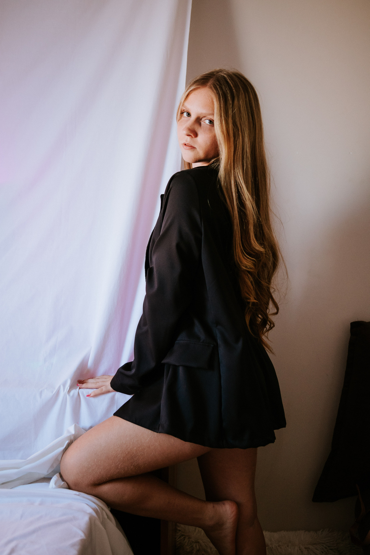 Nessa imagem, minha intenção era equilibrar ousadia e delicadeza. As mãos tocam o tecido com suavidade, mas existe aquela dúvida no ar — o que ela está usando por baixo do blazer preto? O joelho levemente apoiado na beira da cama guia o olhar de quem vê, criando curiosidade e provocando sem mostrar. É esse jogo de sugestão que constrói a força da imagem.