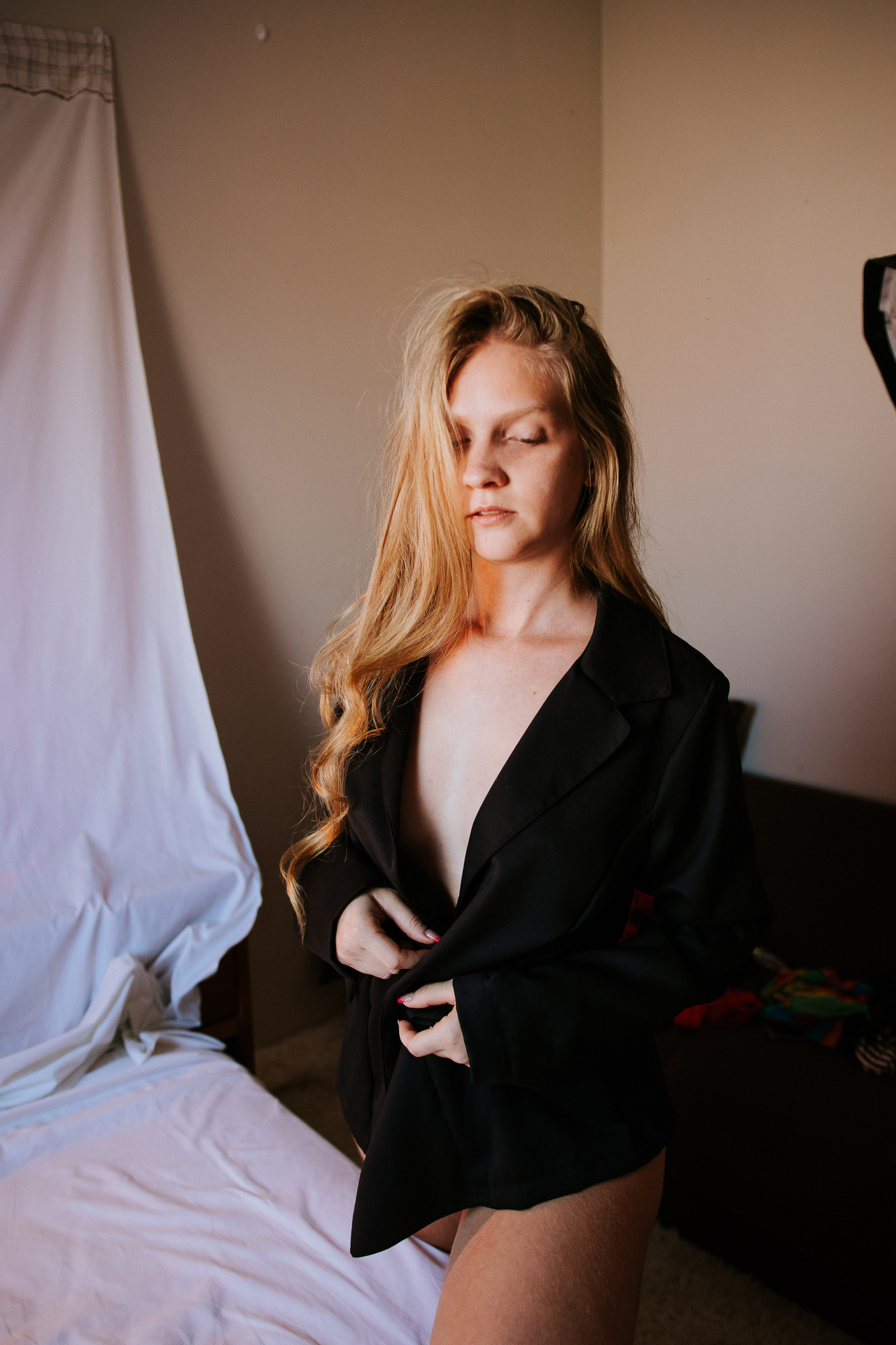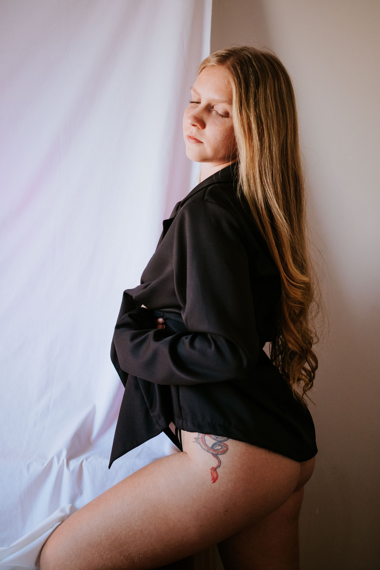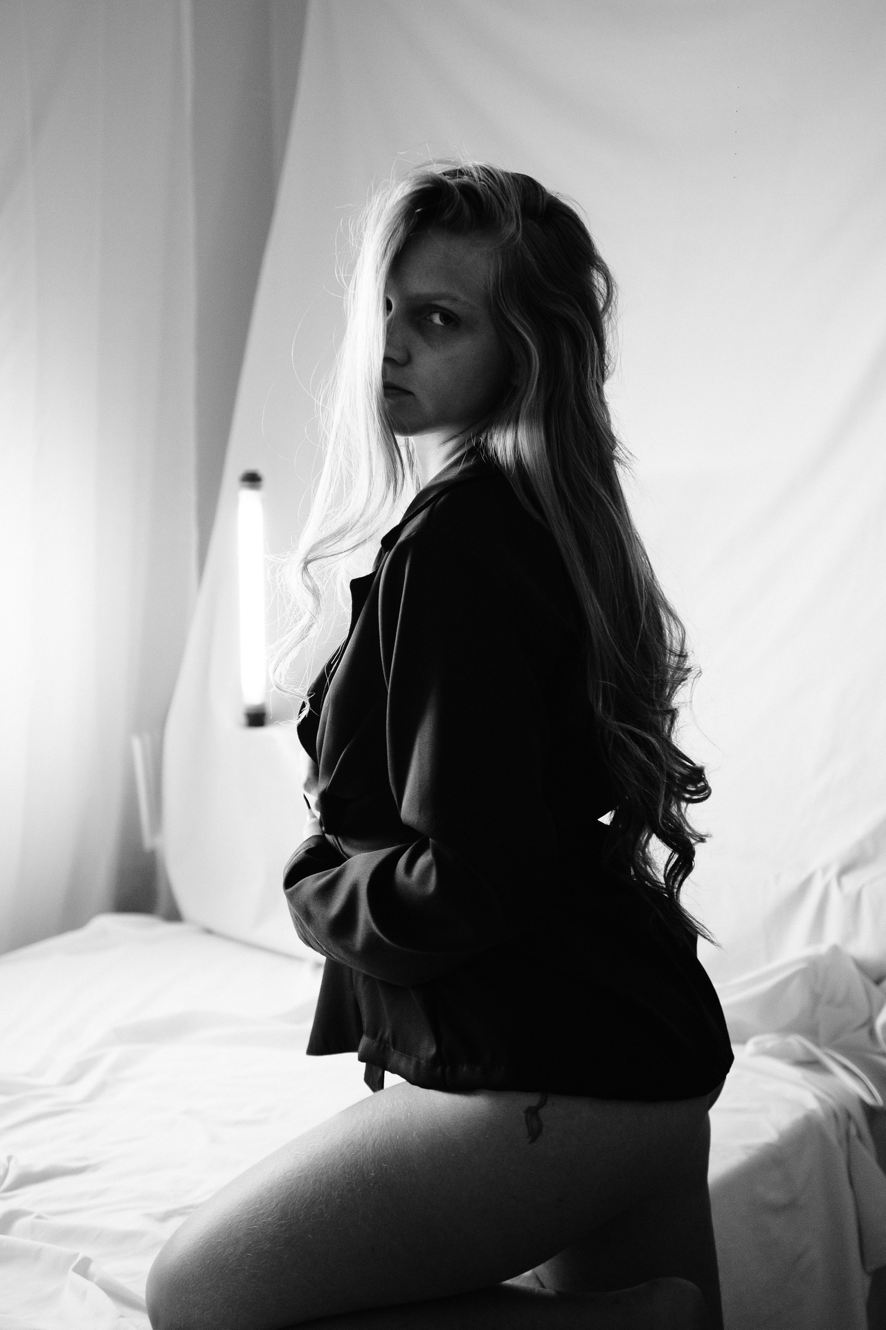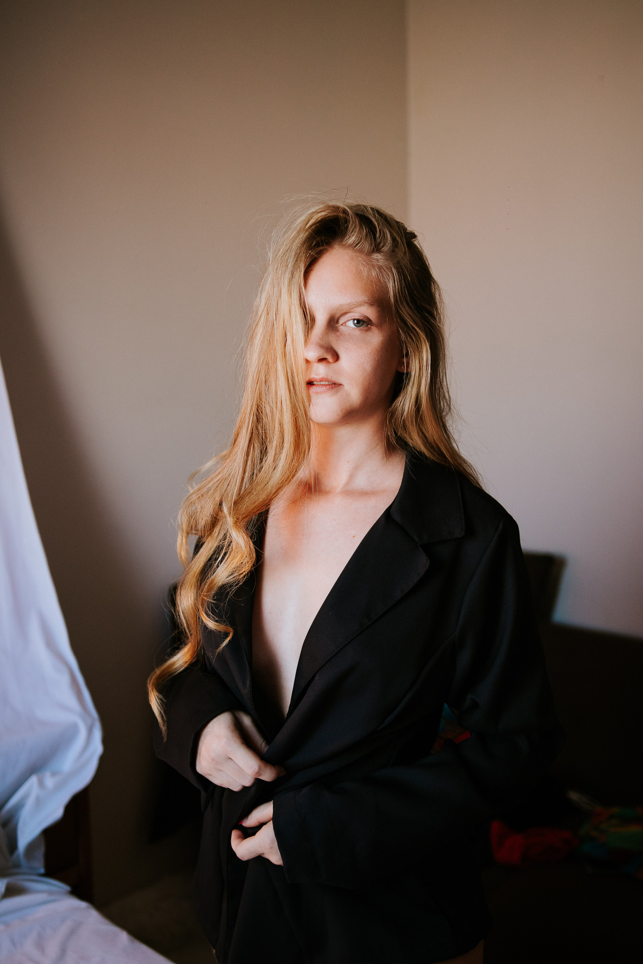 Nessa imagem, minha intenção era equilibrar ousadia e delicadeza. As mãos tocam o tecido com suavidade, mas existe aquela dúvida no ar — o que ela está usando por baixo do blazer preto? O joelho levemente apoiado na beira da cama guia o olhar de quem vê, criando curiosidade e provocando sem mostrar. É esse jogo de sugestão que constrói a força da imagem.