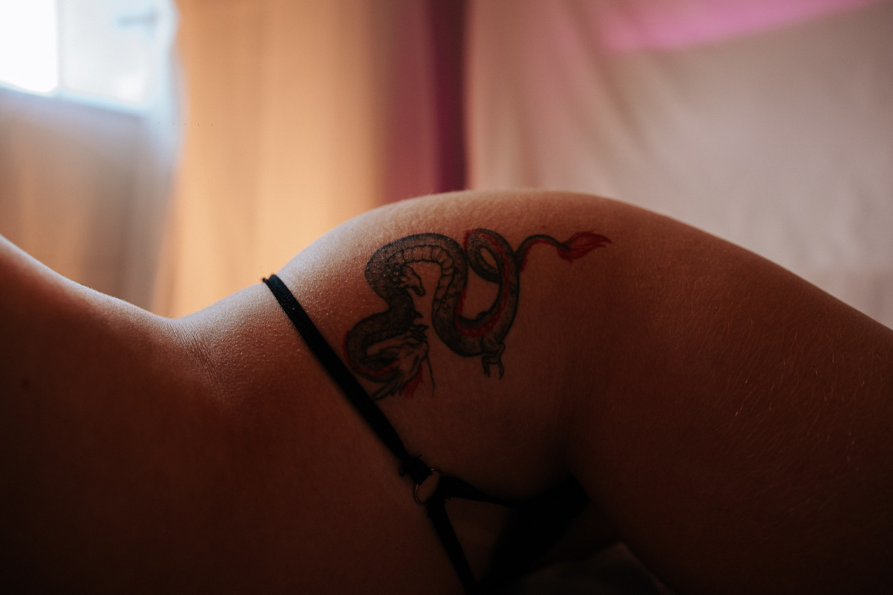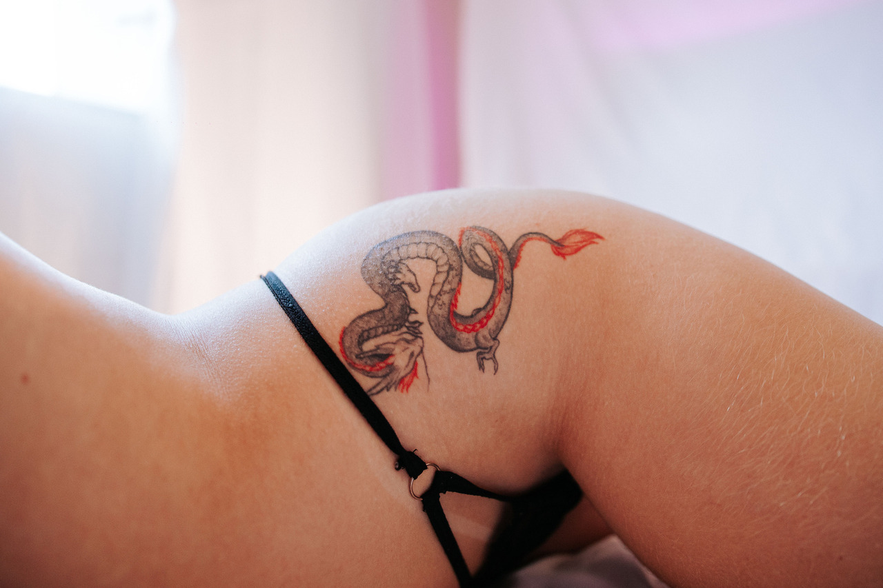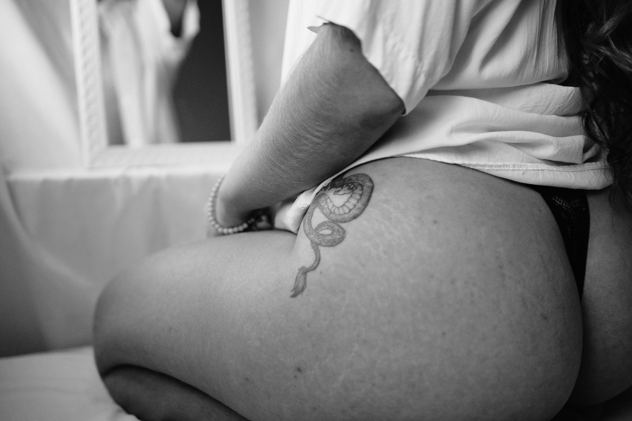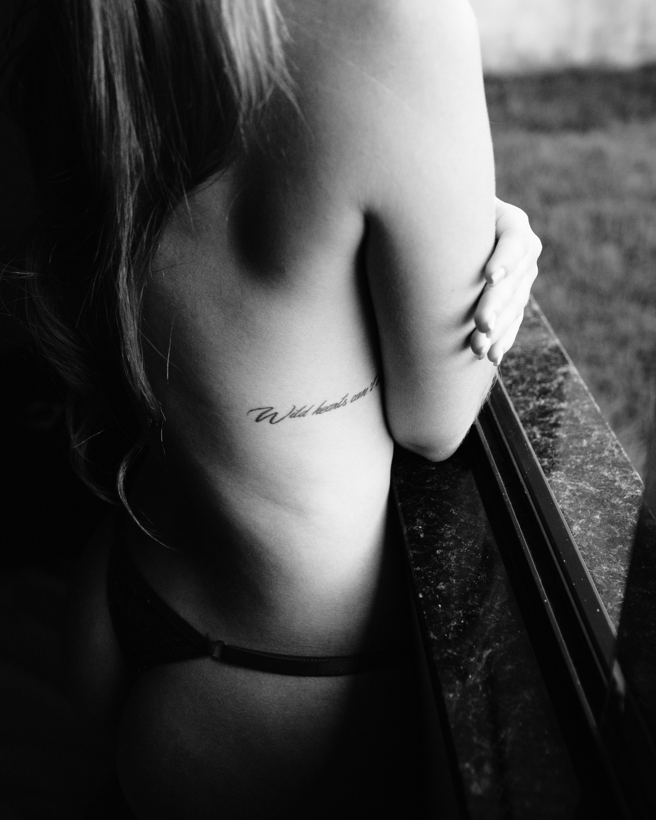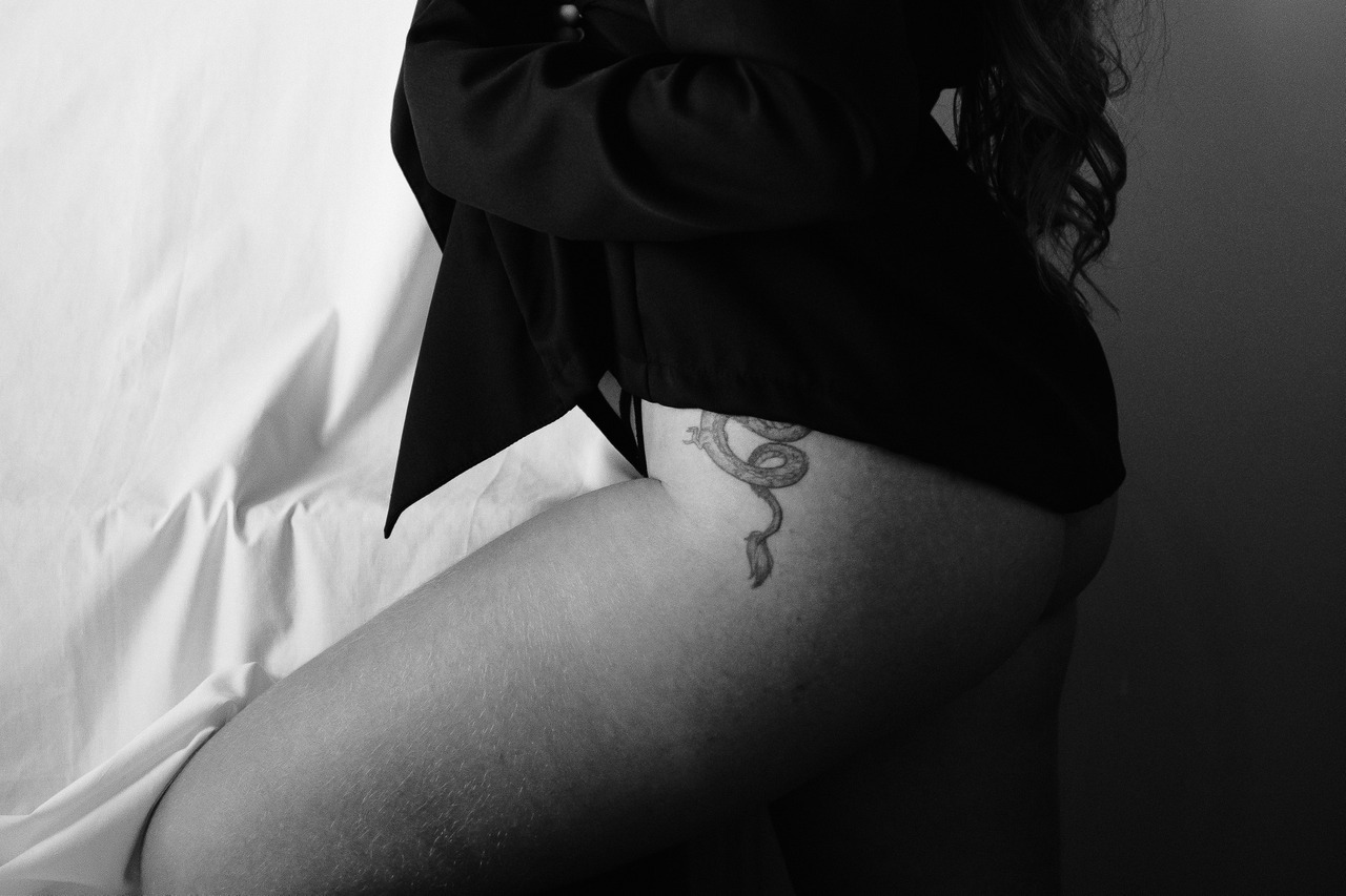 Enquanto ela falava da tatuagem, eu fiz essa foto mais próxima. E as fotos que vieram na sequência foram só consequência de uma boa conversa e de uma conexão real entre fotógrafo e modelo.