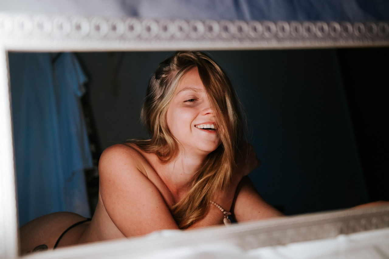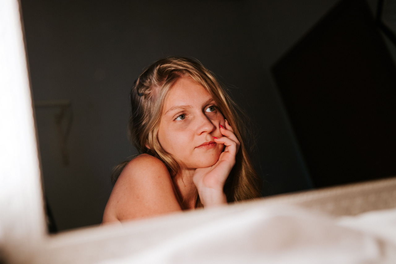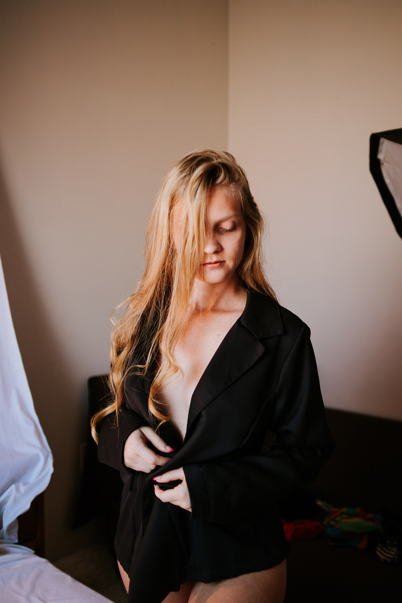 Pensa comigo: o ambiente é super casual, um quarto comum… e ela tá prestes a fazer um ensaio muito íntimo. É natural que qualquer pessoa fique apreensiva, com medo de não ficar bom, ou até com alguma objeção consigo mesma.