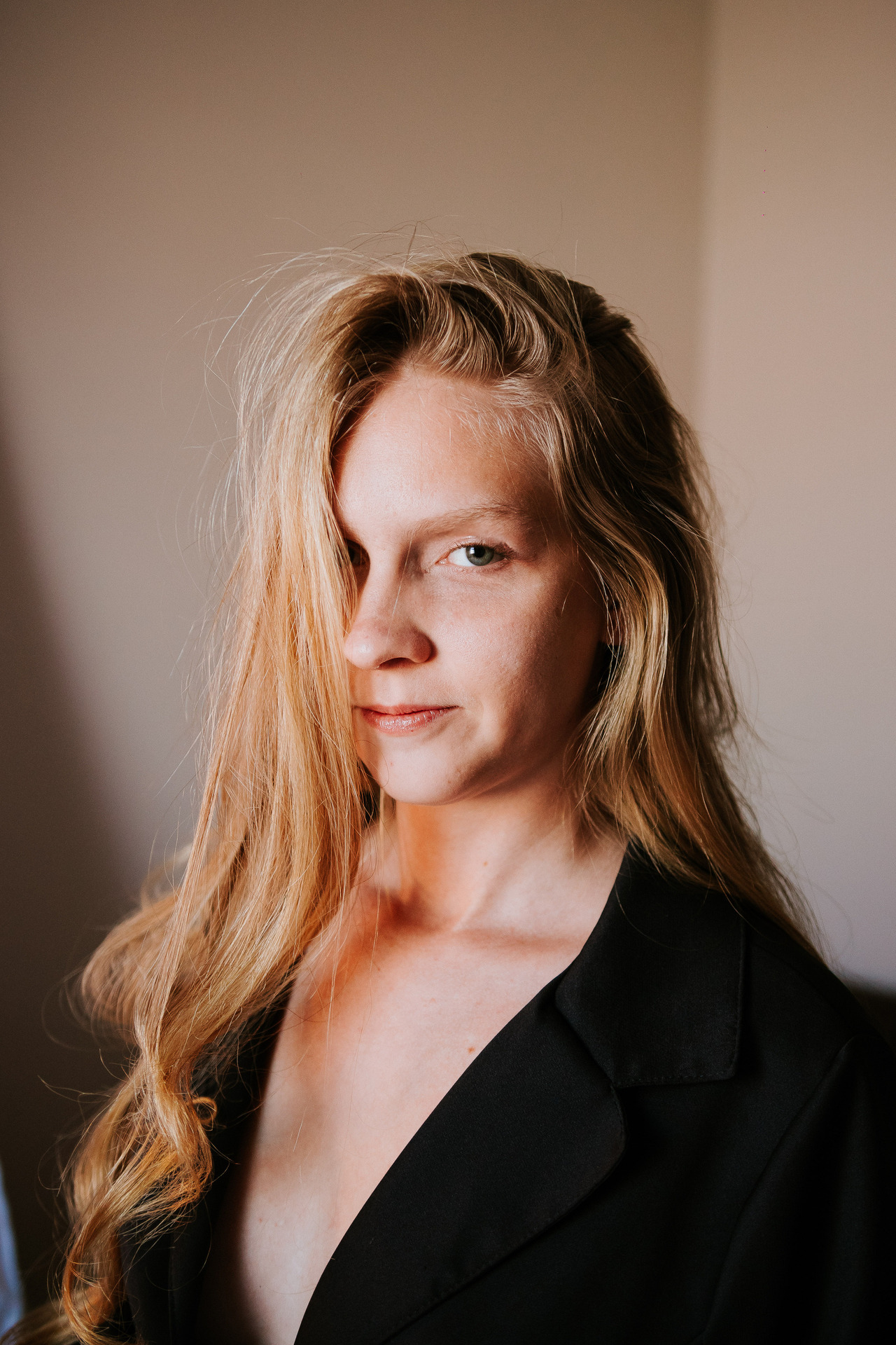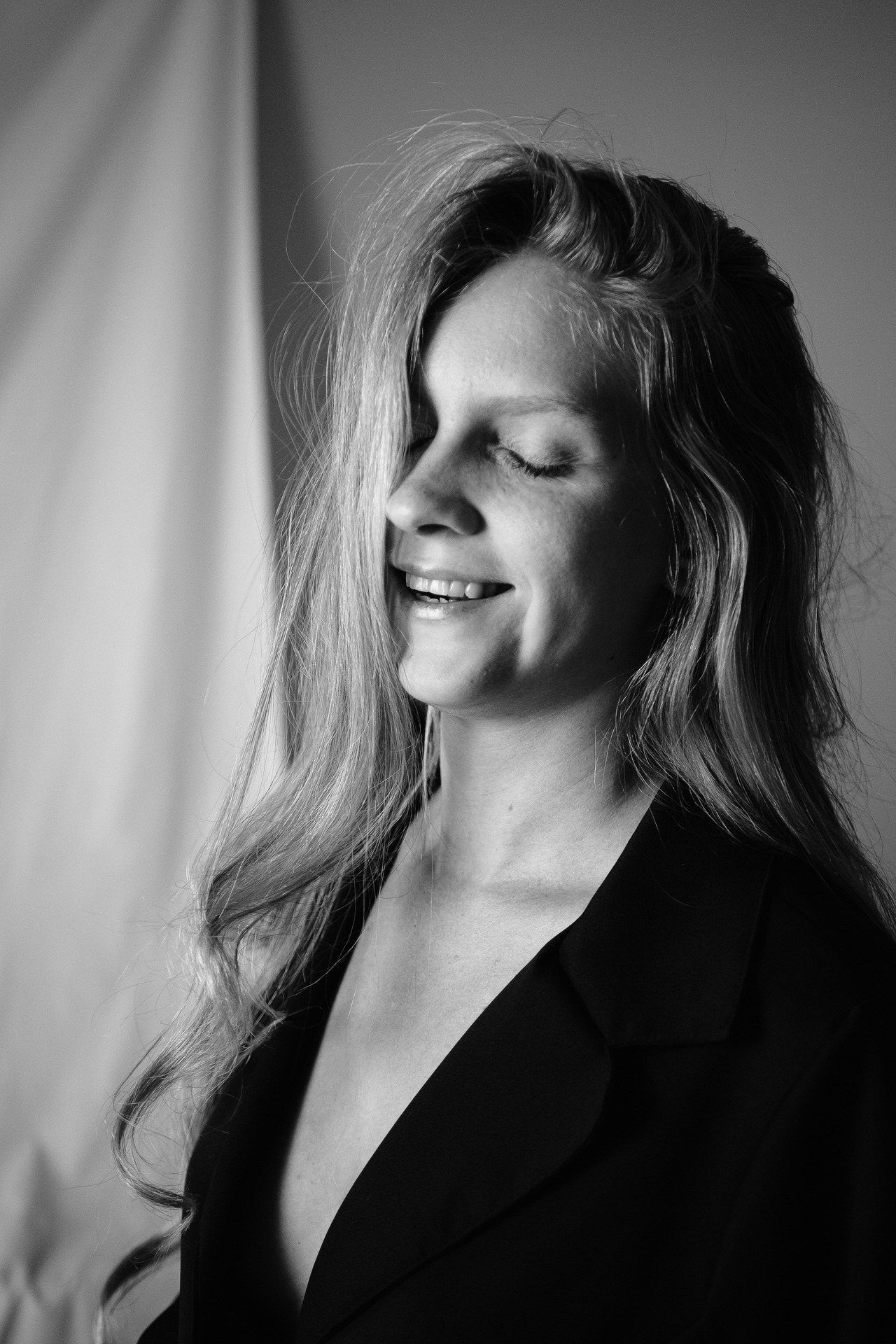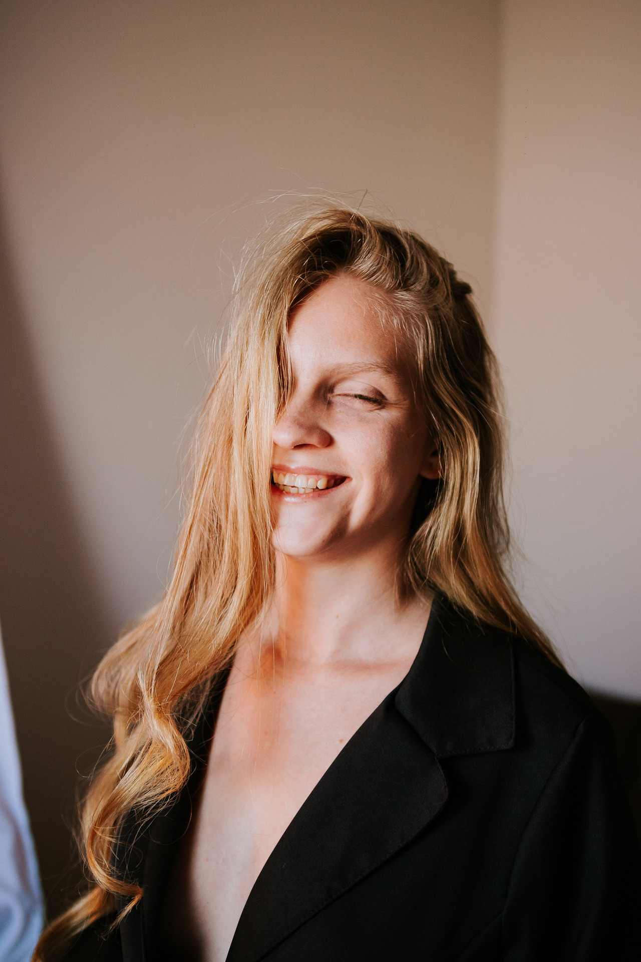 Nessa cena, posicionei ela contra a luz e pedi pra, levemente, abrir os lábios com um olhar mais suave. E, como sempre, vale lembrar: as mãos eu peço pra deixar onde ela se sentir mais confortável. Só quando isso não funciona ou não fica visualmente interessante, aí sim, eu direciono e peço pra colocar onde, pra mim, fica mais bonito na foto.