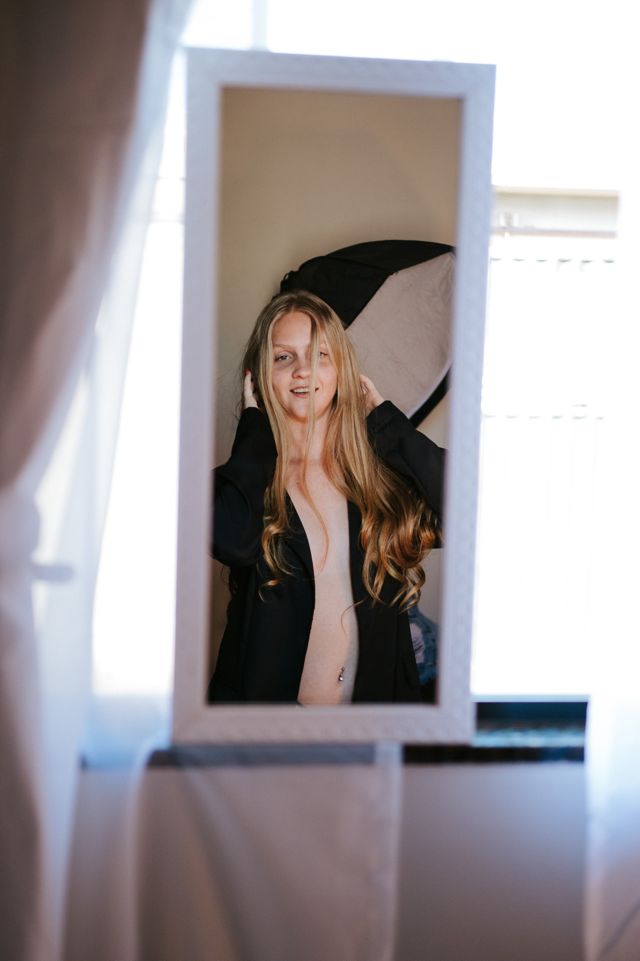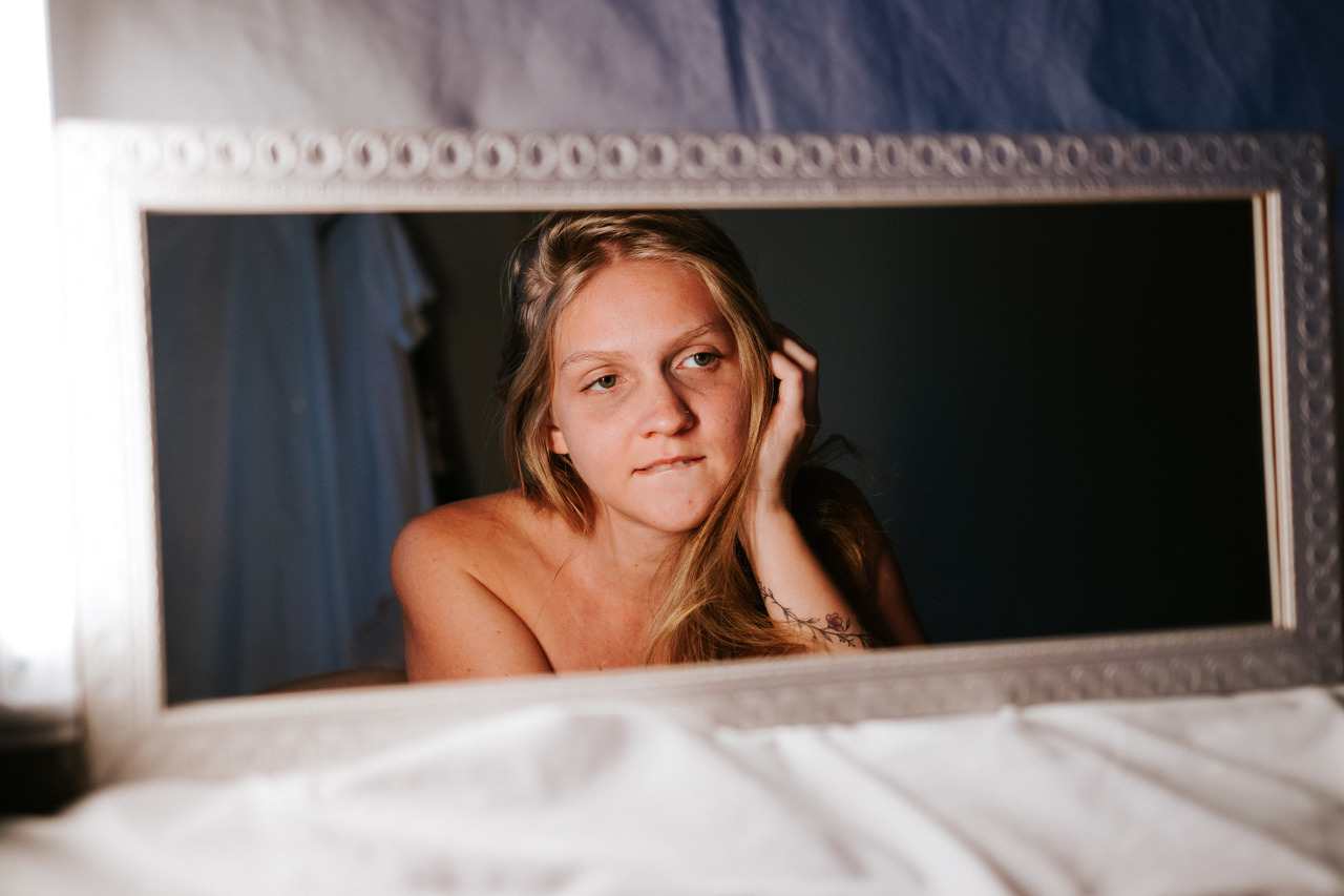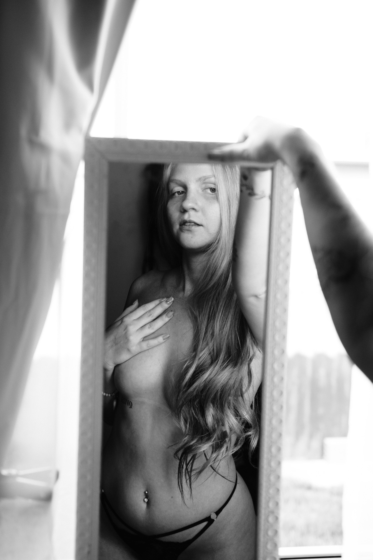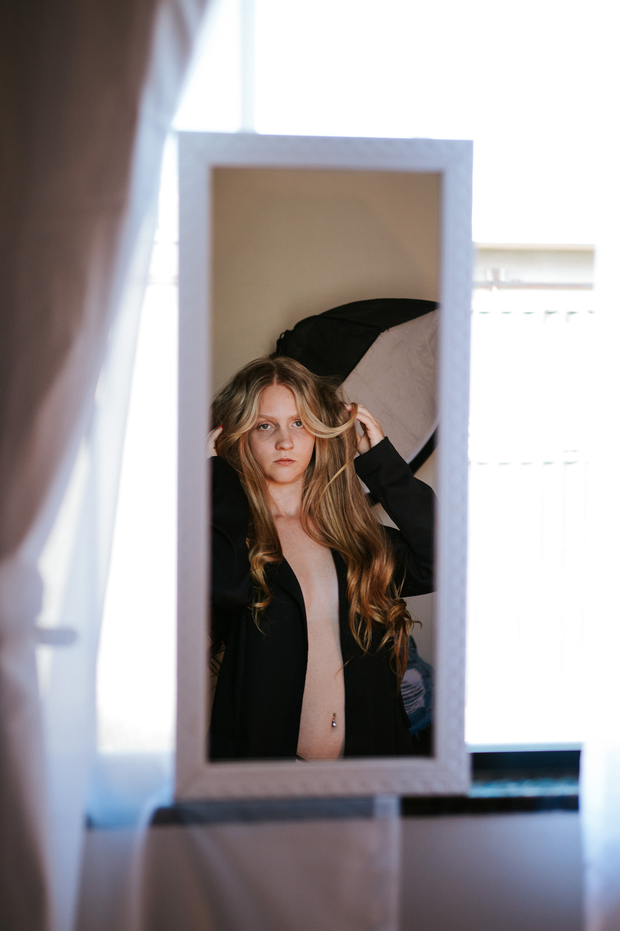 Aqui, ela já sabe que o corpo está visivelmente aparente — e isso, pra ela, já é normal. Ela pegou a essência do ensaio e, nesse momento, minha direção é direta, simples e rápida: “segura o espelho, tampa um dos seios com a mão, o outro com o cabelo, abaixa o queixo, vira o rosto”… coisas assim.