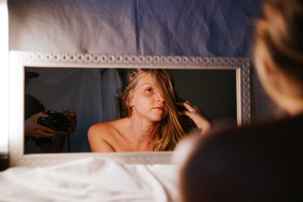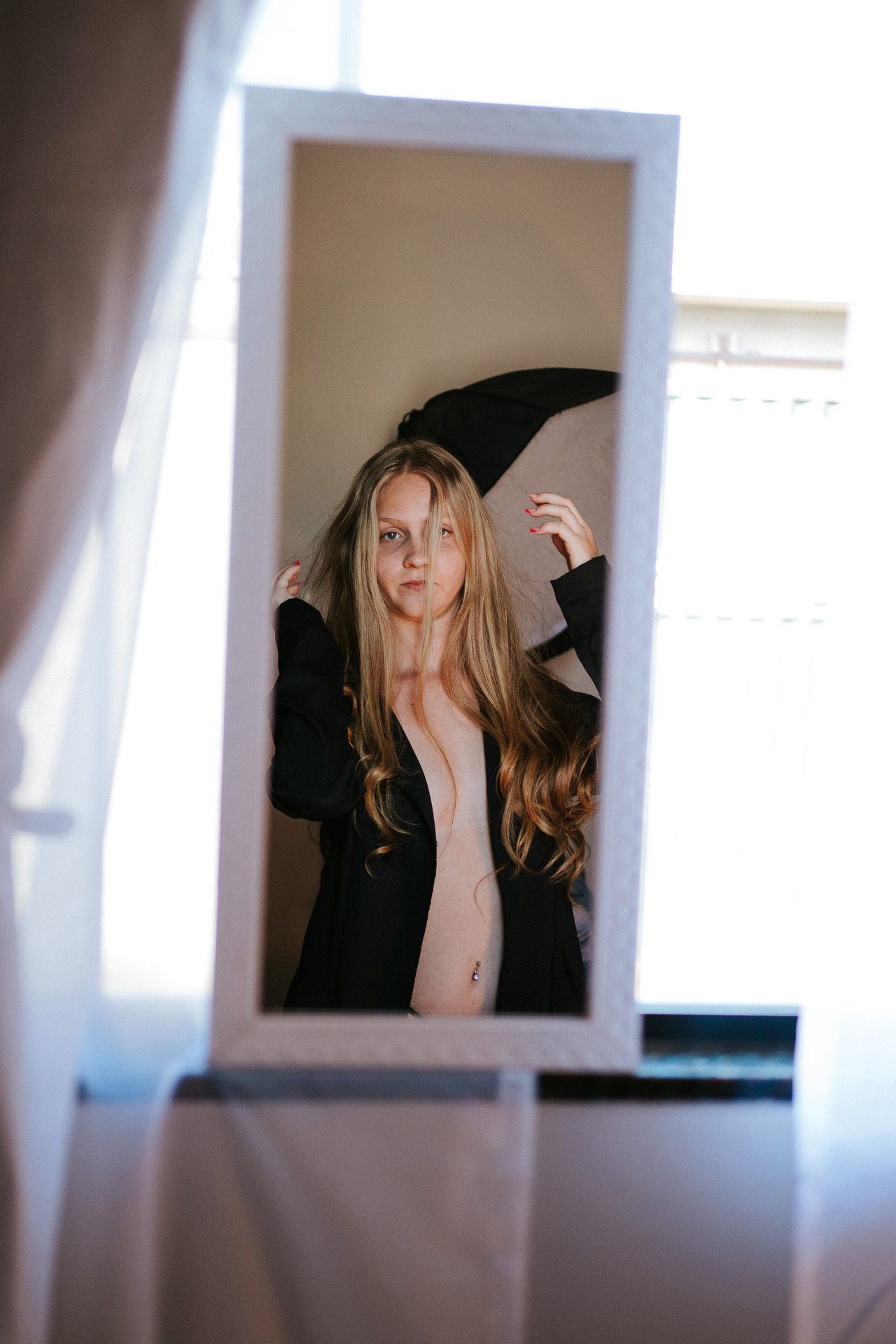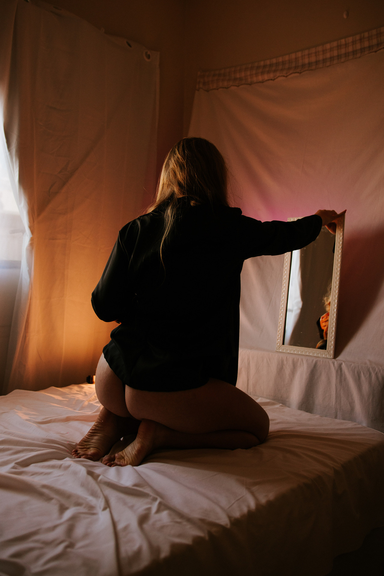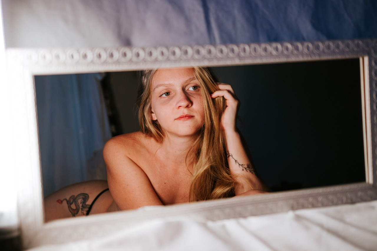 Aqui, ela já sabe que o corpo está visivelmente aparente — e isso, pra ela, já é normal. Ela pegou a essência do ensaio e, nesse momento, minha direção é direta, simples e rápida: “segura o espelho, tampa um dos seios com a mão, o outro com o cabelo, abaixa o queixo, vira o rosto”… coisas assim.