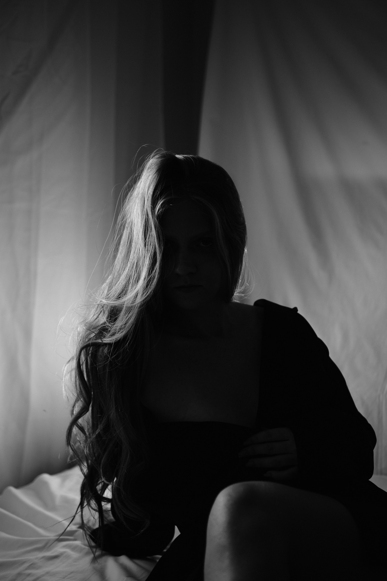 O cenário é simples: cama, lençóis claros, uma janela, um espelho… e é justamente nessa simplicidade que a minha fotografia ganha força. Não tem excesso, não tem distração. O foco é a modelo — sua expressão, sua narrativa.