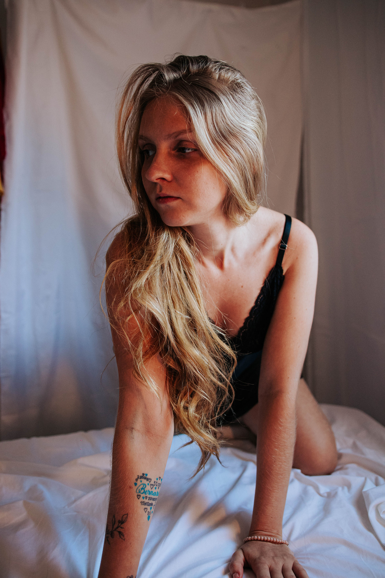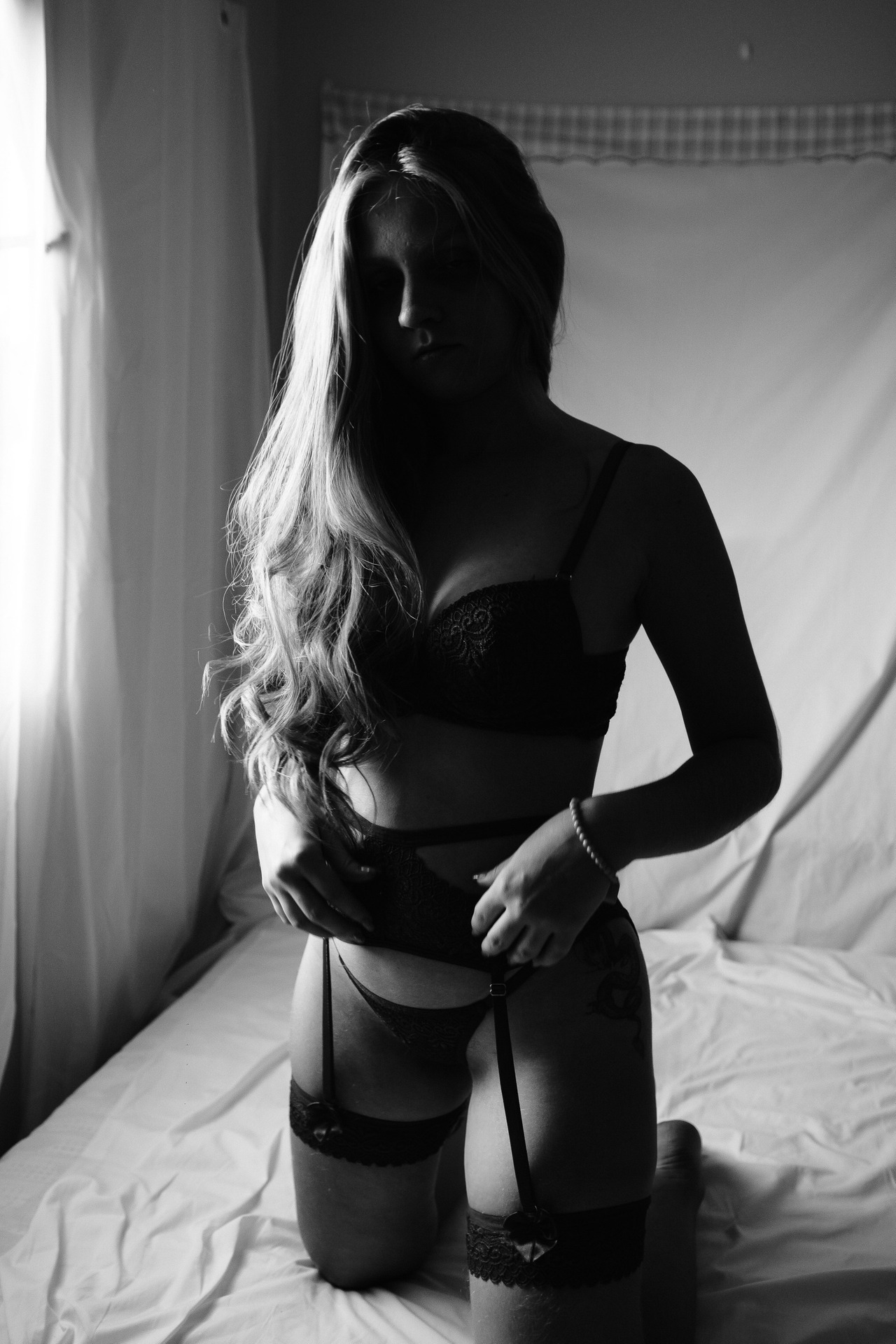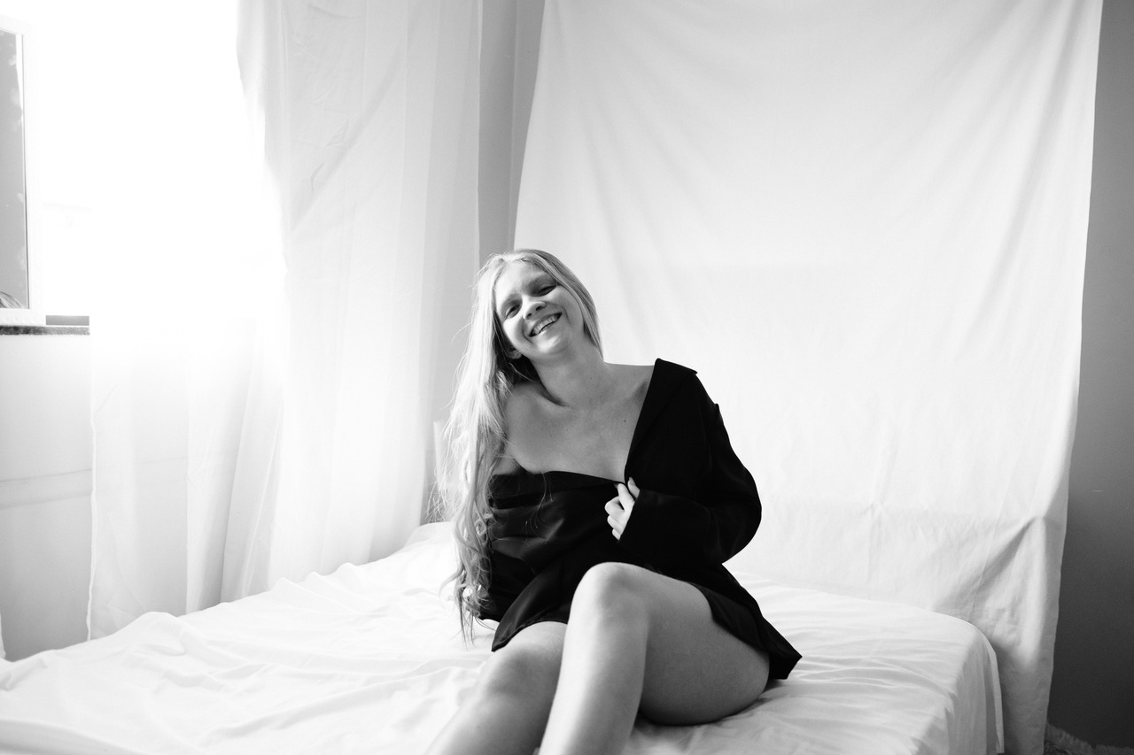 Nessas fotos, minha intenção era apenas deixá-la à vontade. Gostei de como ela ficou, visualmente, ajoelhada na cama. Mas, antes de chegar nessa pose, tínhamos testado várias outras: em pé no chão, sentada na cama, de várias formas… e nada me agradava de verdade. Até que pedi pra ela subir na cama e ficar sobre os joelhos, só pra ver como ficaria — e, vualá, tudo ficou visualmente lindo.