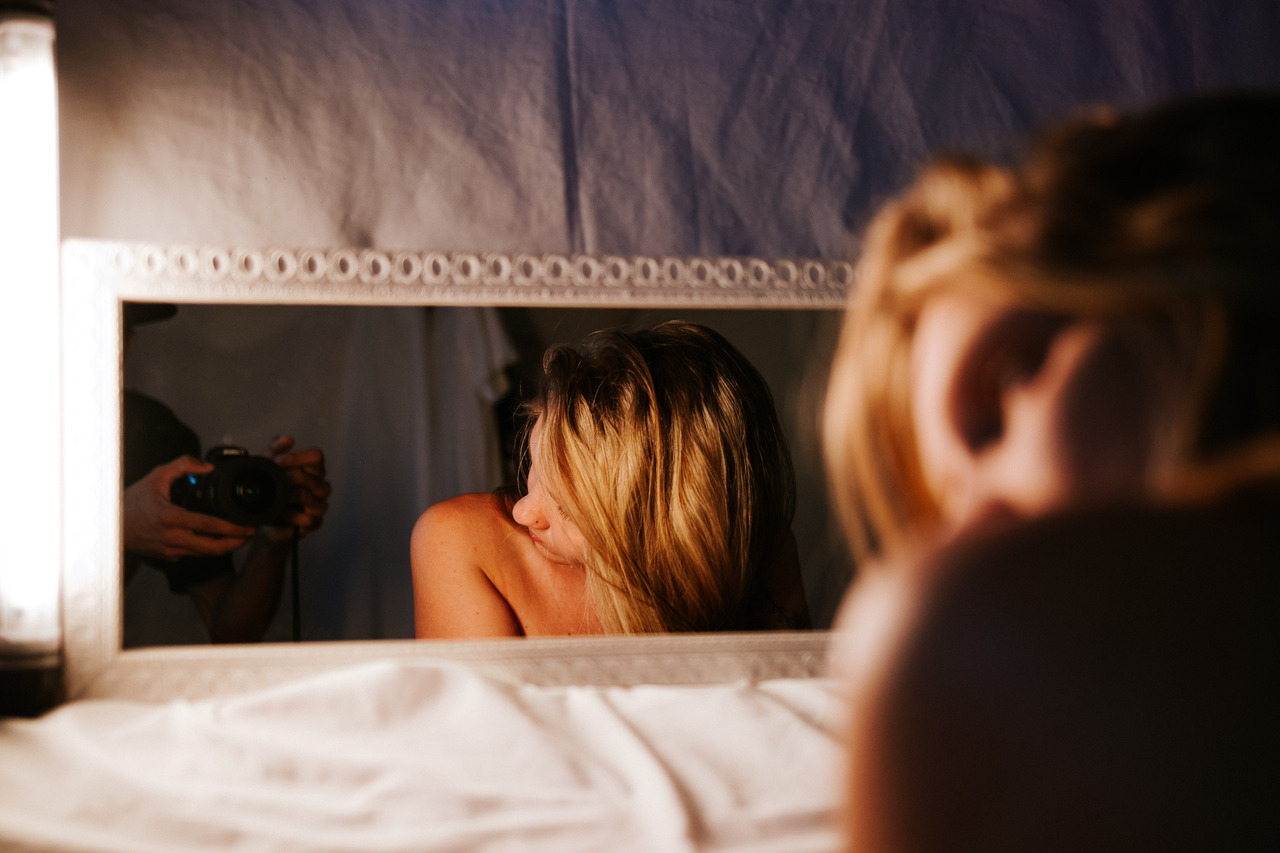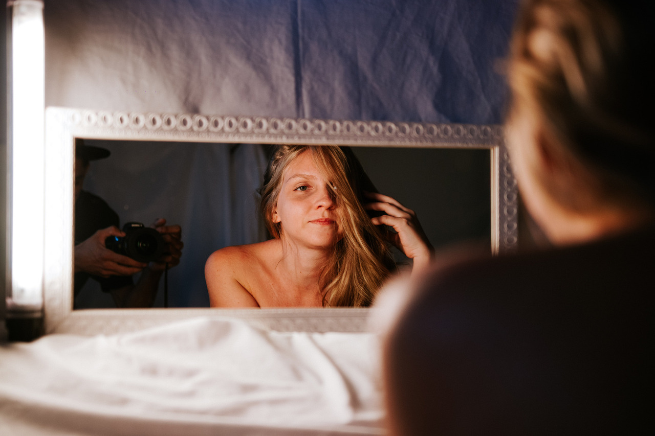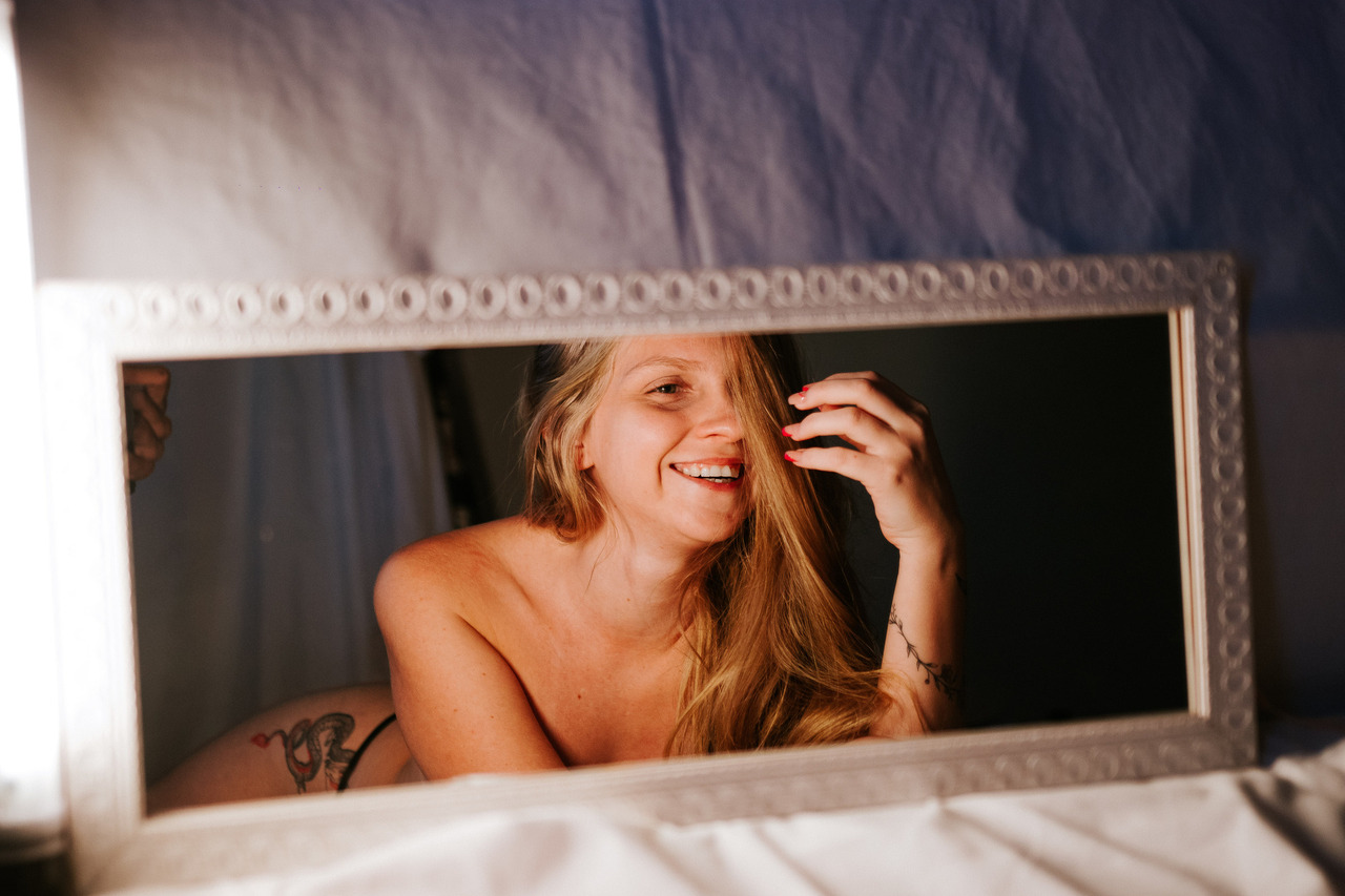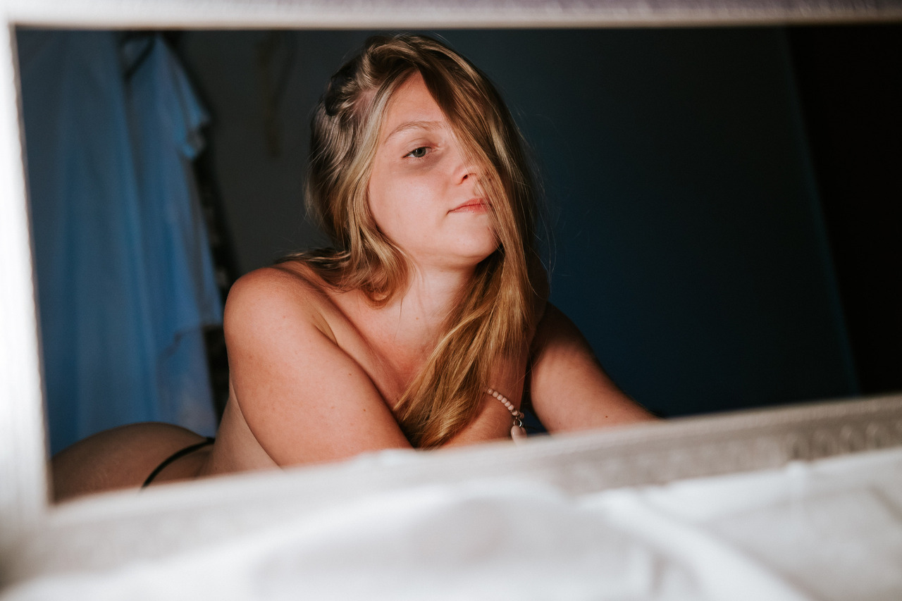 Eu quis usar o espelho em alguns momentos para adicionar uma camada narrativa interessante, explorando reflexos. Além disso, reforça a ideia de autoimagem — algo muito presente na fotografia boudoir contemporânea.