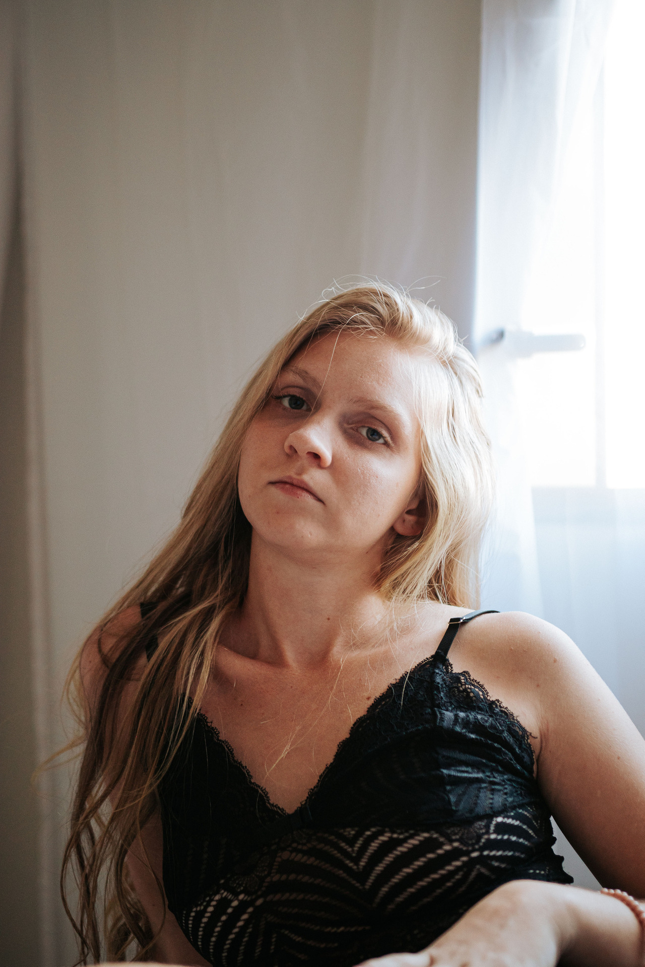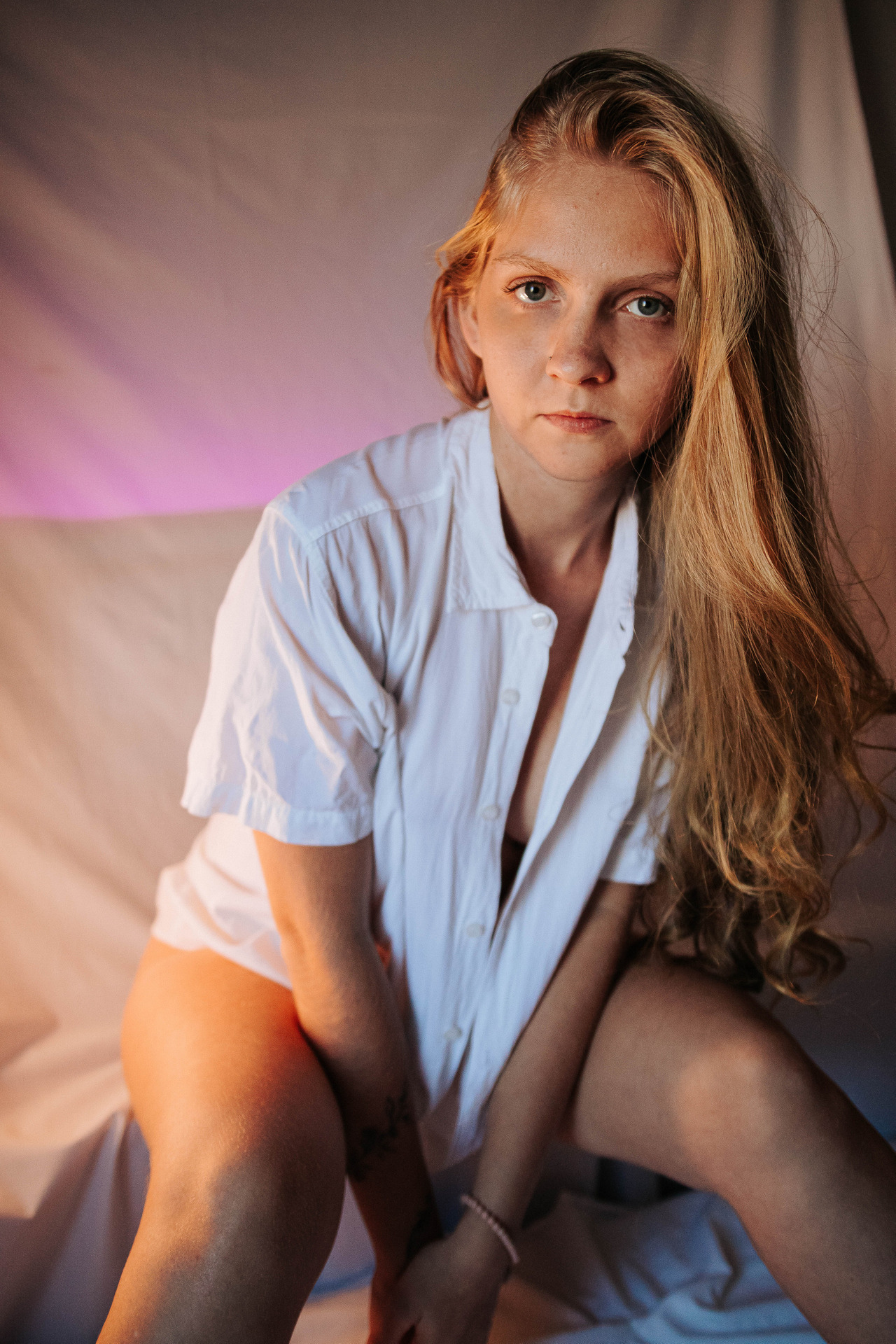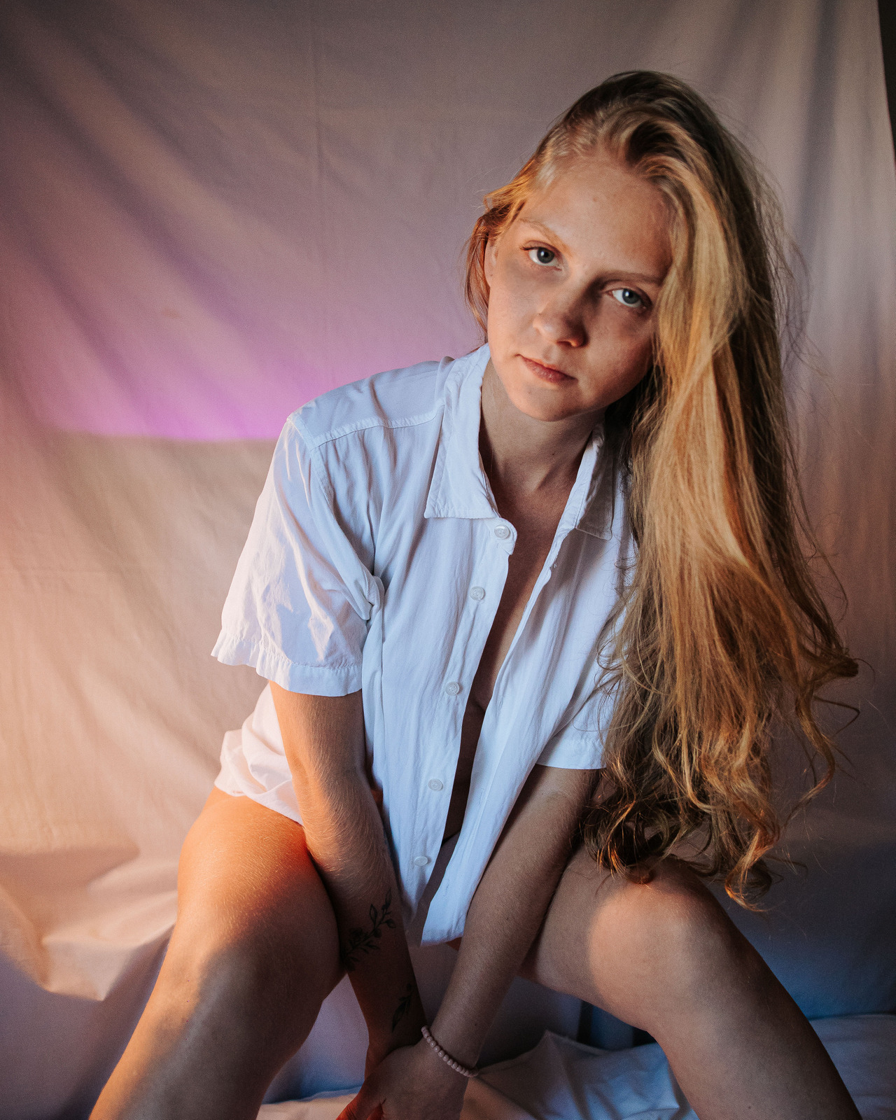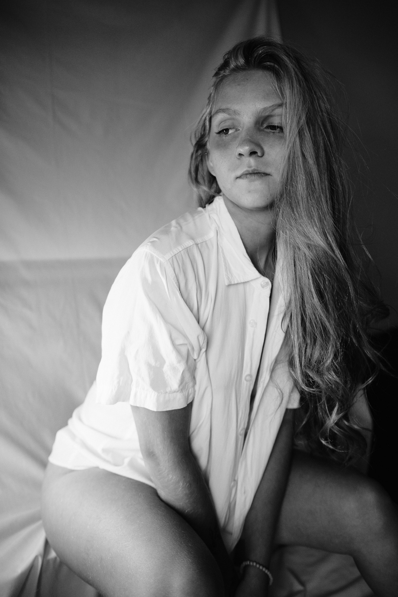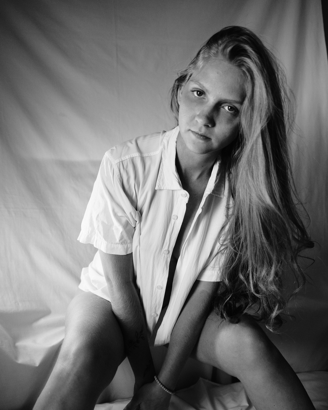 Entre essa imagem e as anteriores, rolou mais uma troca de roupa. Pedi pra ela tirar o short pra gente explorar uma proposta diferente. E, como falei lá atrás, esse momento é sempre delicado, porque a troca aconteceu ali mesmo, no mesmo ambiente. Mas com toda a narrativa que a gente foi construindo ao longo do ensaio, ela já se sentia segura, sem constrangimento. Aqui já é arte acontecendo, trabalho fluindo, ideias progredindo. Em poucos minutos, criamos uma intimidade e uma compreensão muito reais.
