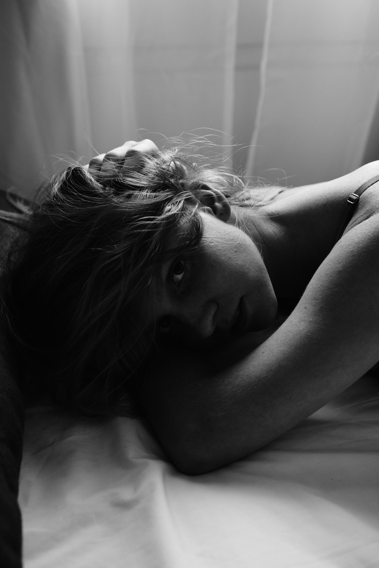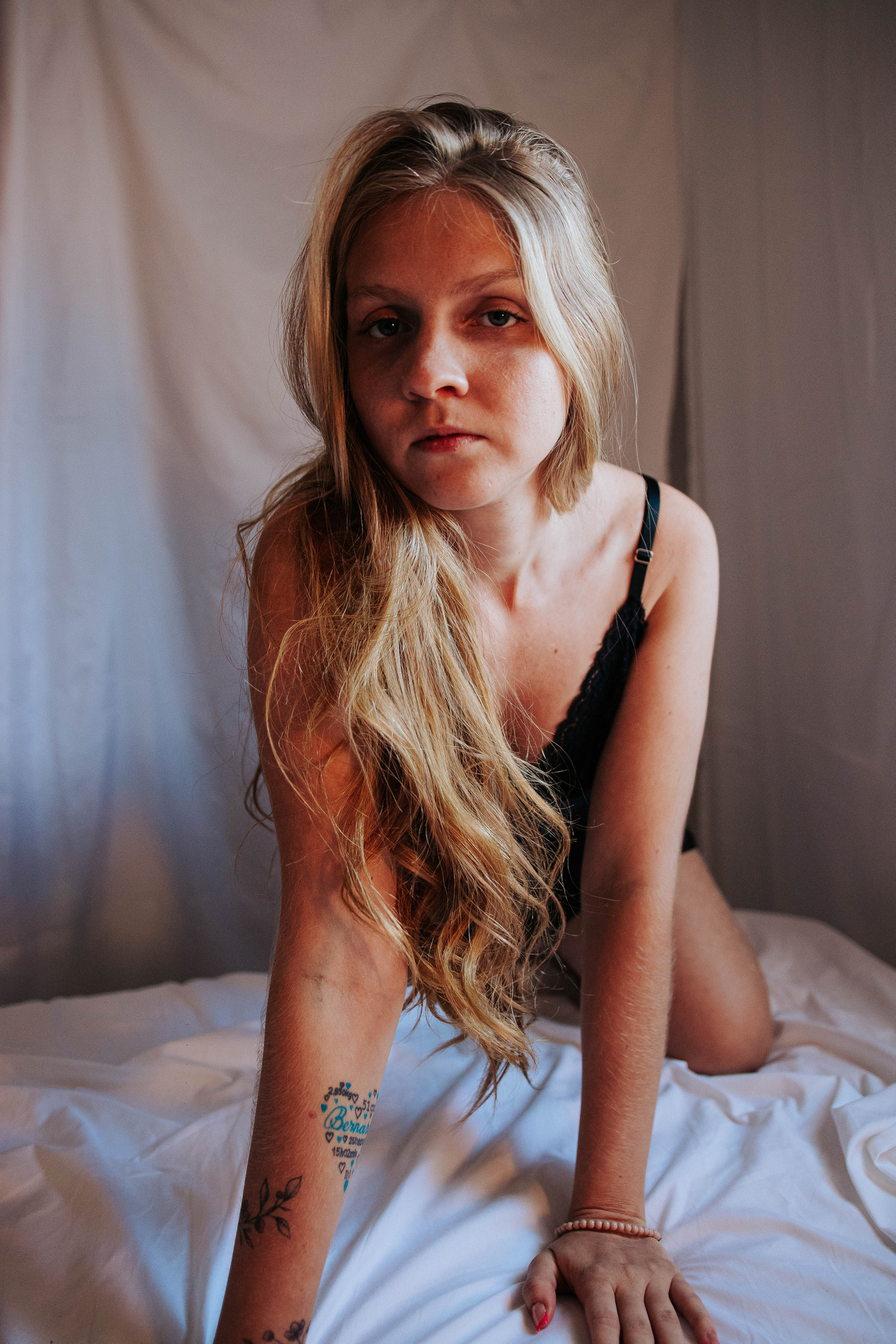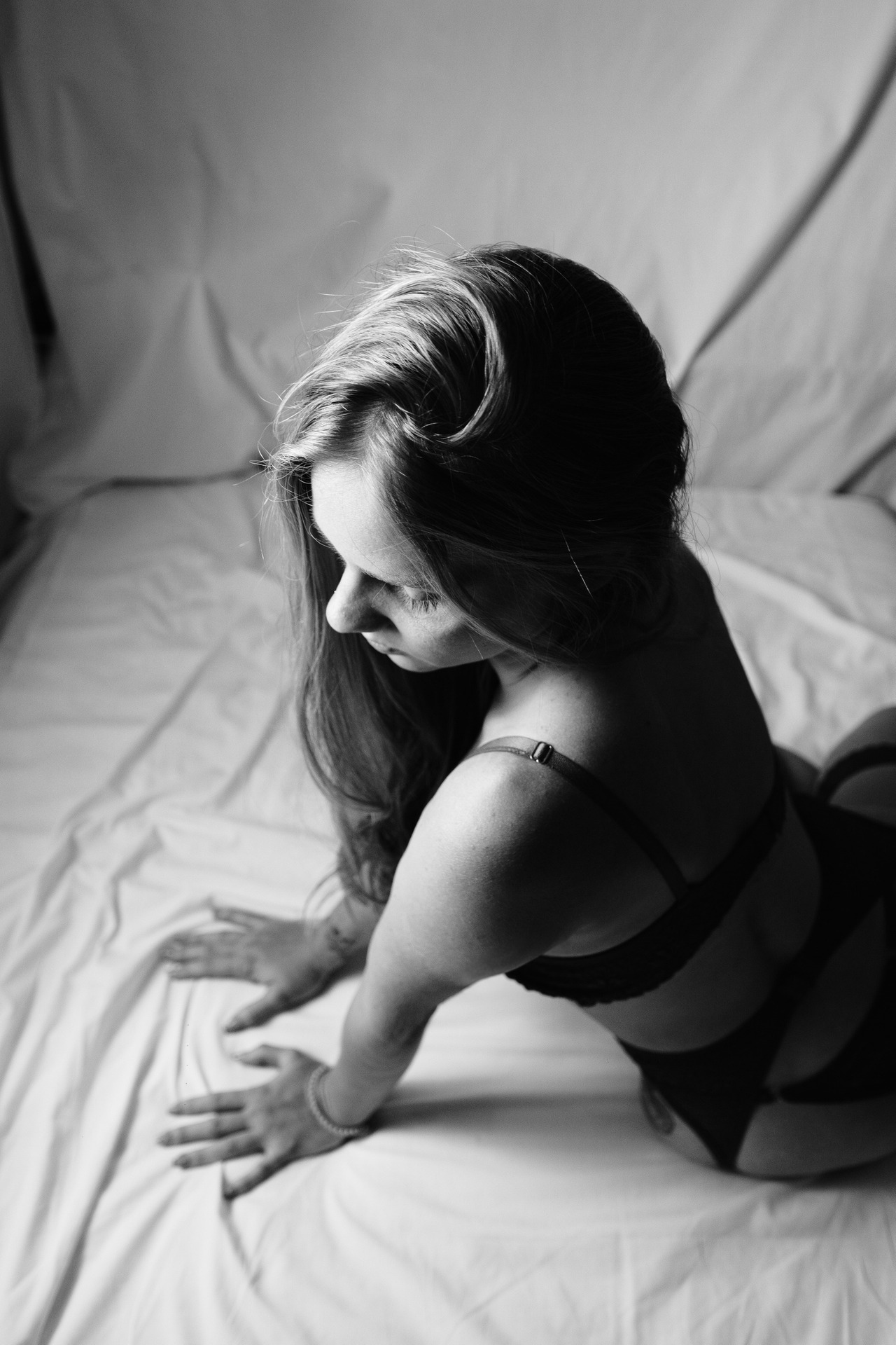 Essa ideia abaixo é simplesmente uma referência de algum ensaio que eu já tinha visto antes, em algum momento. Como ela já estava bem mais à vontade, ficou fácil pedir: queria uma expressão mais séria, as mãos sobre a cama, inclinando o corpo pra frente — num comportamento mais invasivo, que chega mais perto de quem está olhando a foto.