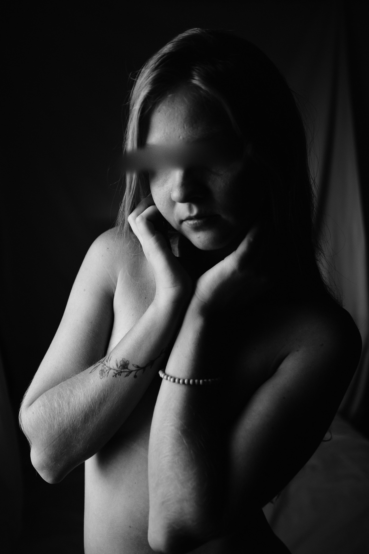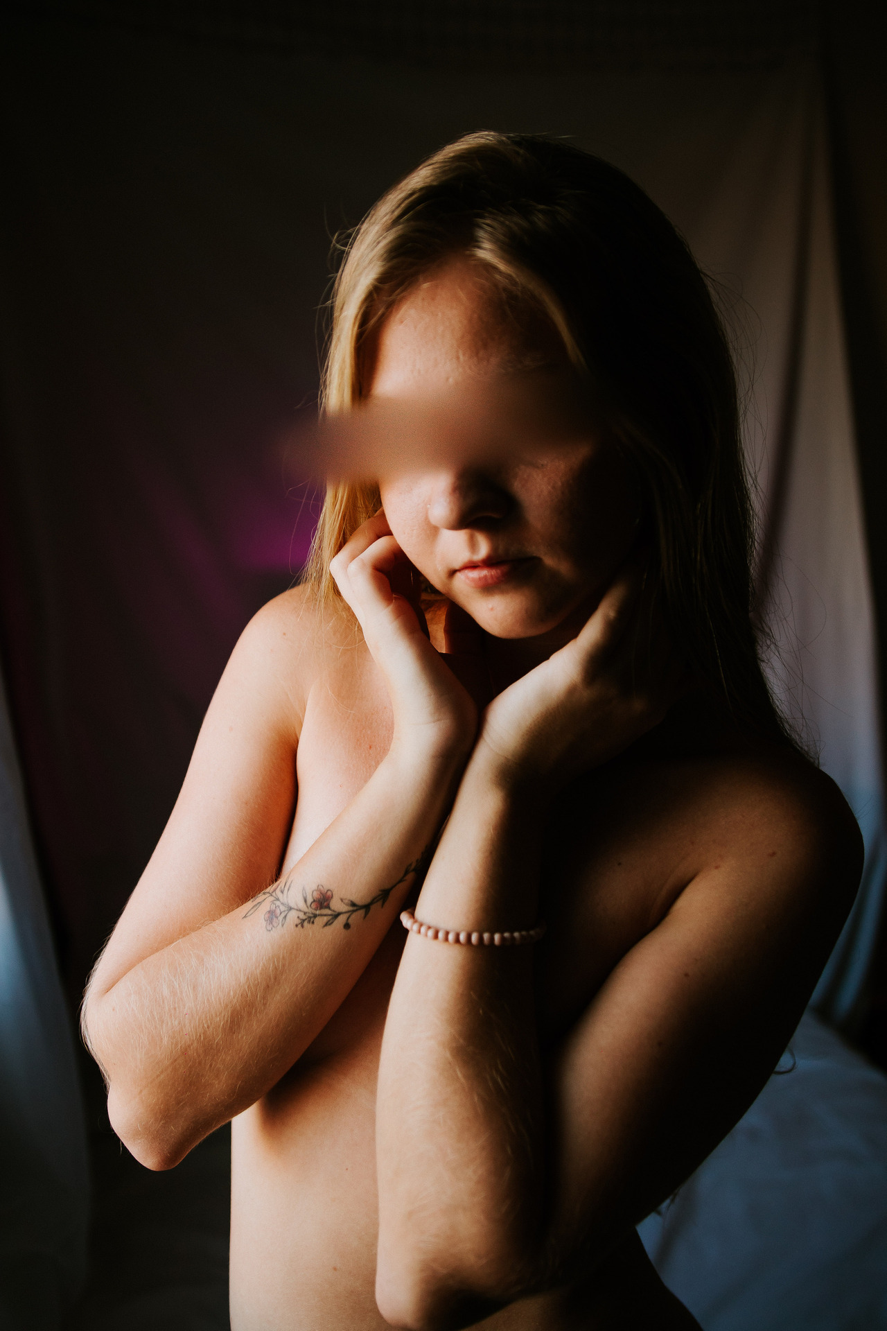 Essa reação espontânea de colocar a mão no rosto foi puro nervosismo, por se sentir completamente nua sendo fotografada — e eu registrei exatamente isso.